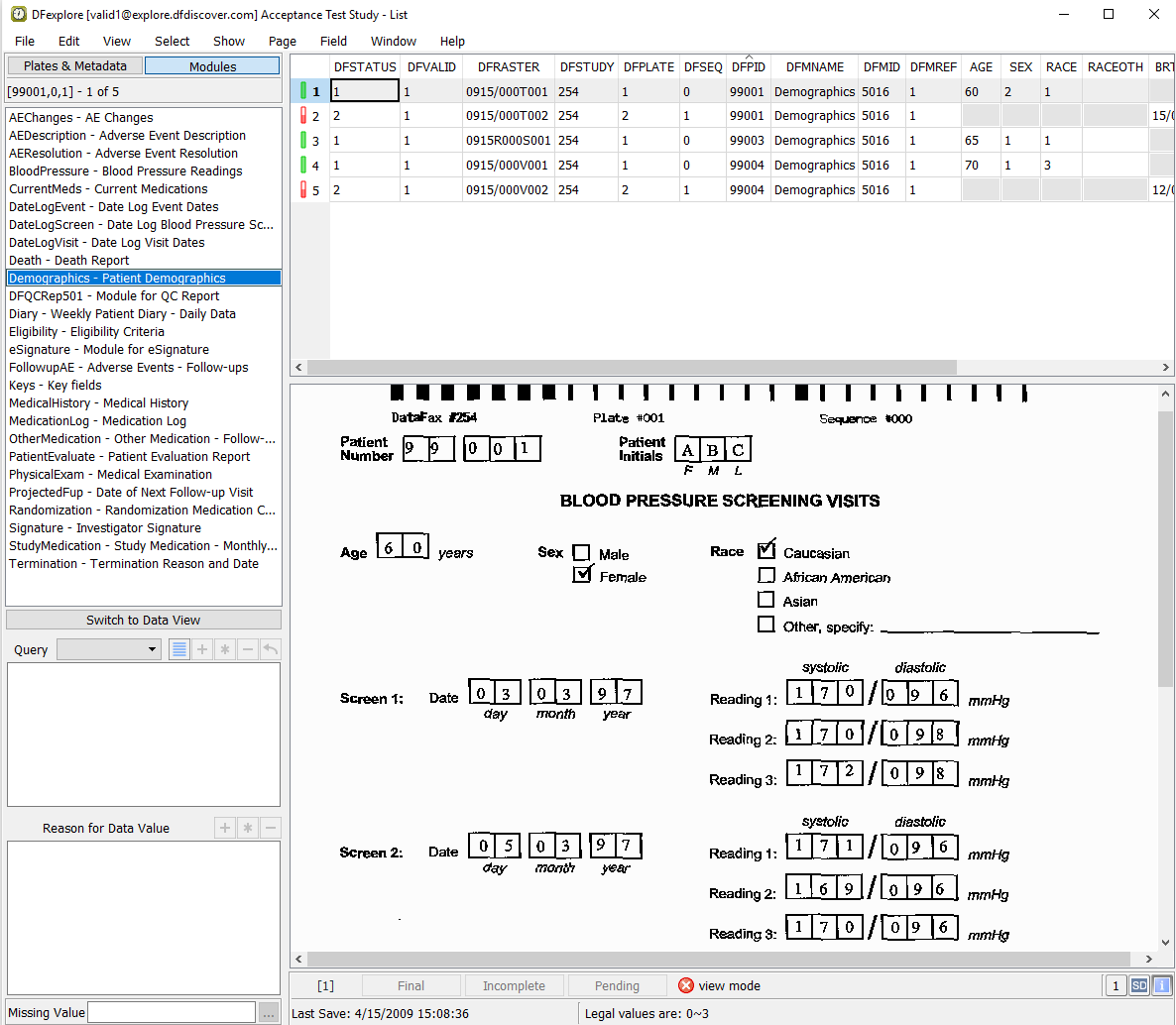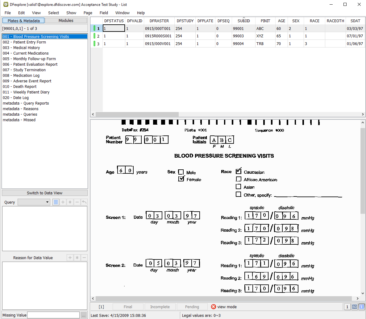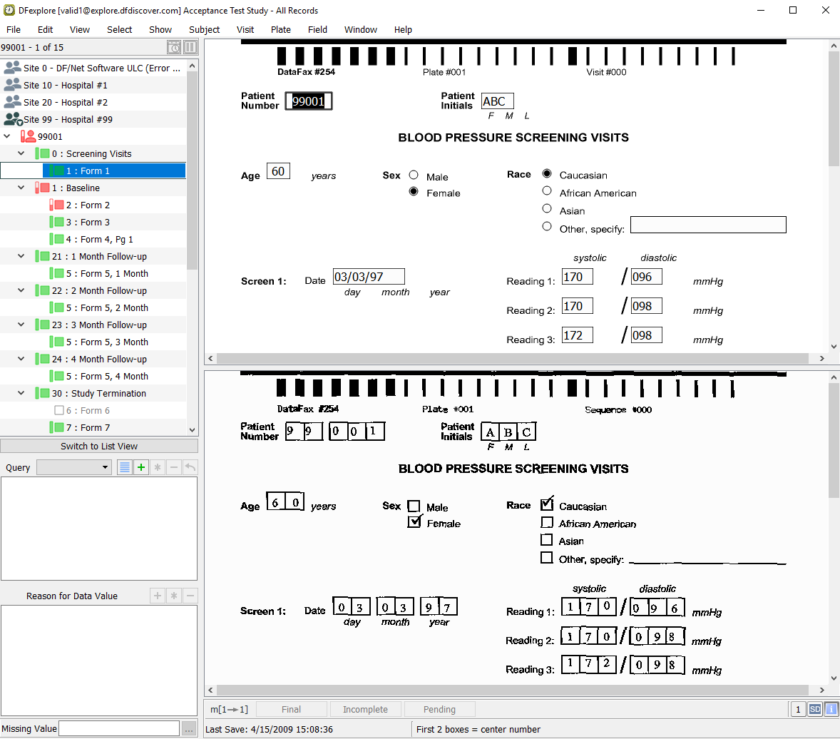 Double-click entry for 99001. This closes 99004 and opens the list of visits for 99001. Select > to open all visits and pages for subject 99001. In the record list panel, locate 1: Form 1 under Screening Visits. Click it to open the page in the main data window.