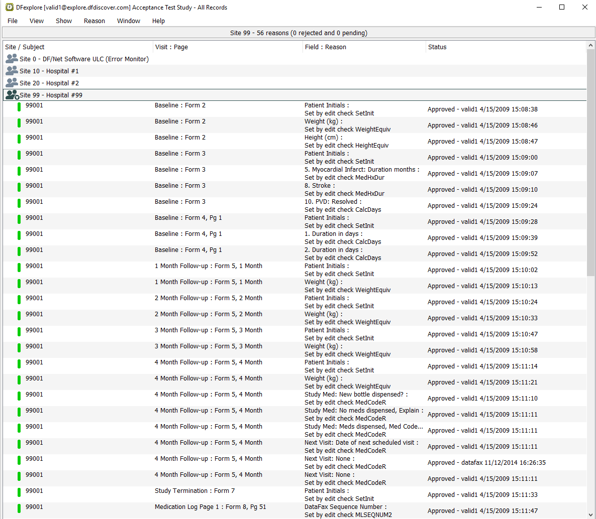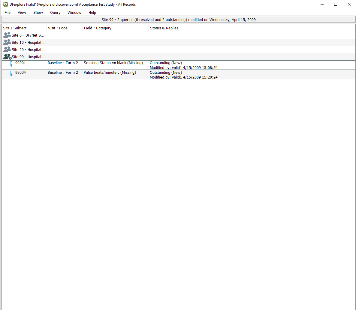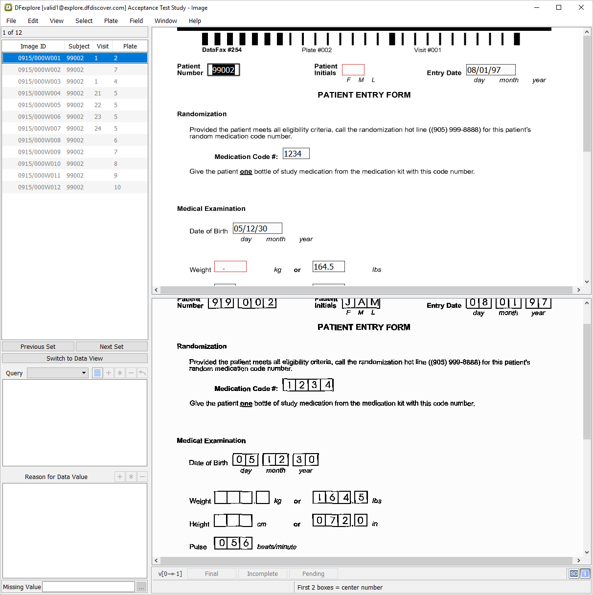 Double-click entry for 99001. This closes 99004 and opens the list of visits for 99001. Select > to open all visits and pages for subject 99001. In the record list panel, locate 1: Form 1 under Screening Visits. Click it to open the page in the main data window.