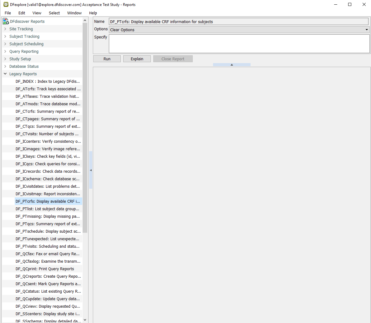 Select > to switch to Reports View. In the reports list panel, double-click DFdiscover Reports followed by Legacy Reports. Highlight the report DF_PTcrfs from the list of legacy reports.