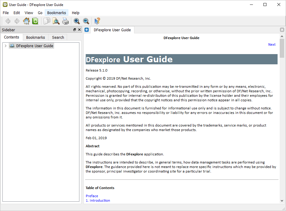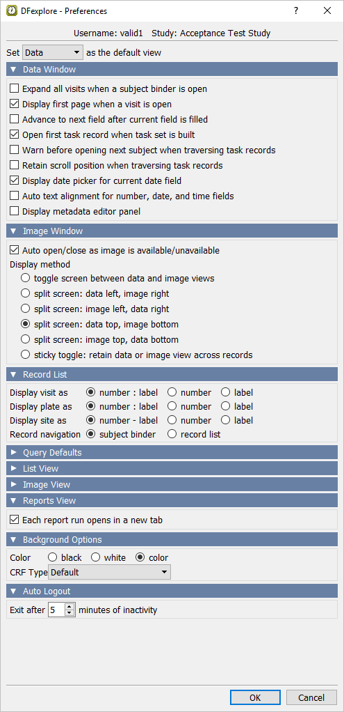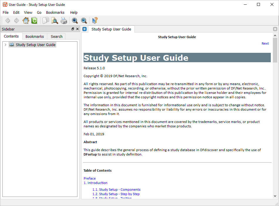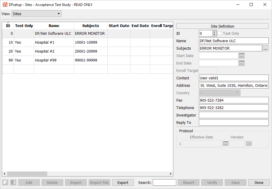 Login and verify the on-line setup documentation. Open the Acceptance Test Study setup and verify the standard DFsetup views.
