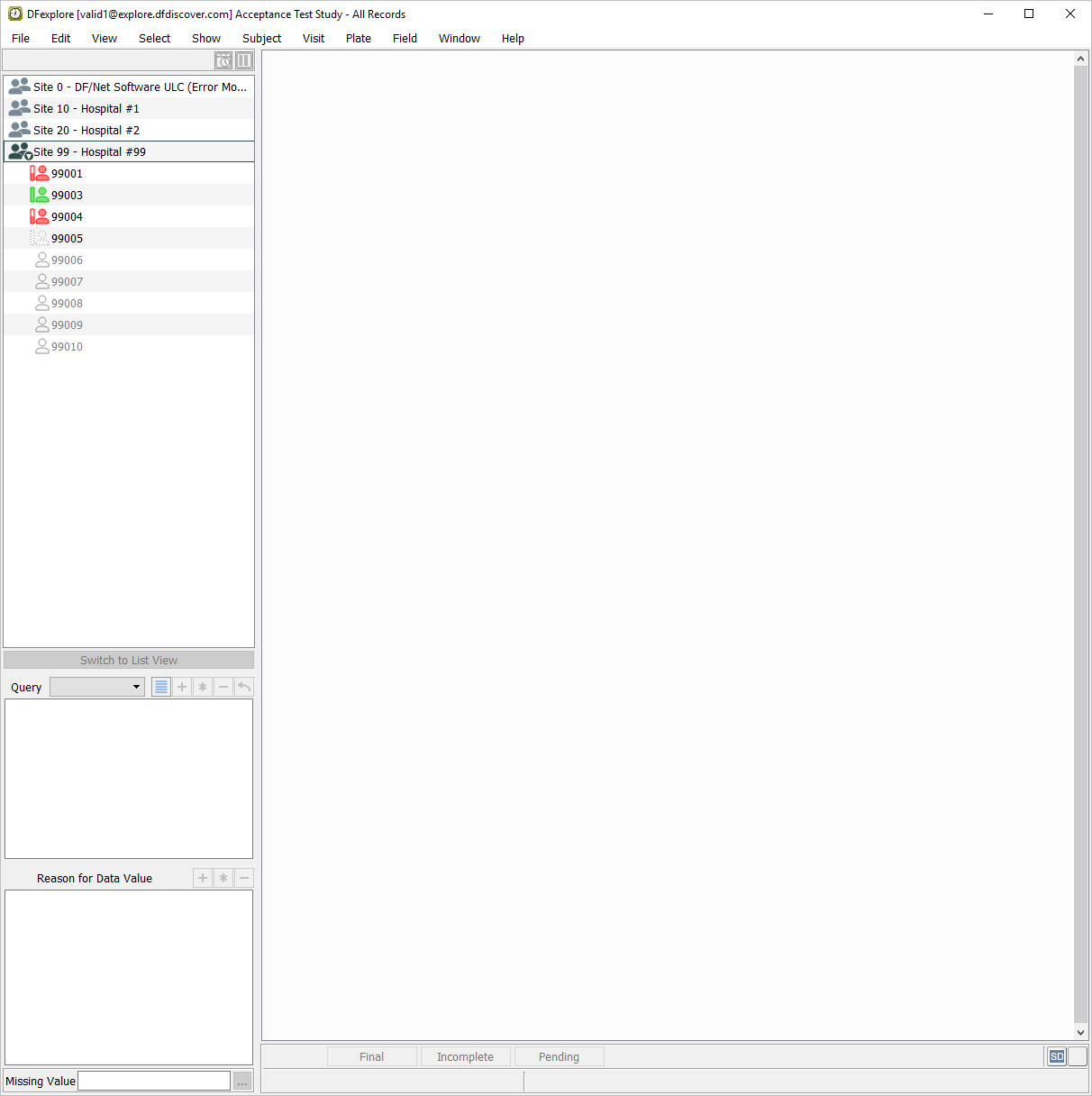 Double-click entry for Site 99 - Hospital #99 in the record list panel. The site opens to display the subject list. The subject list displays all enrolled subjects and the next 5 potential subjects for each site.