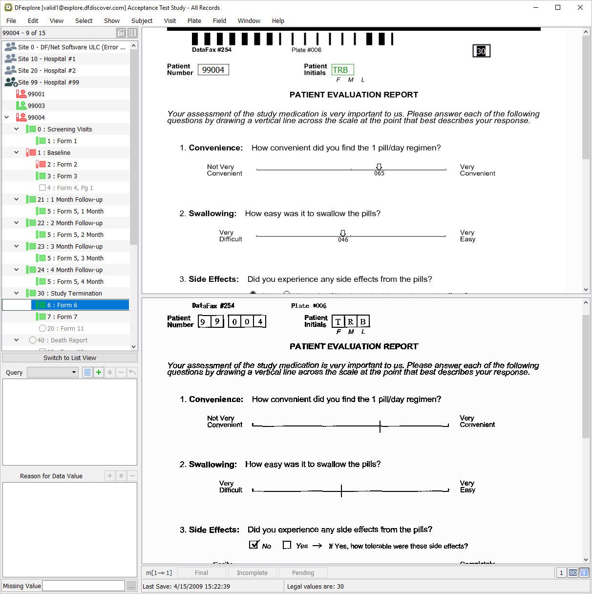 Double-click entry for Subject 99004 to list all visits for that subject. Select > . In the record list panel, locate the 6: Form 6 entry belonging to the Study Termination assessment. Click it to make it the active page in the main data window.