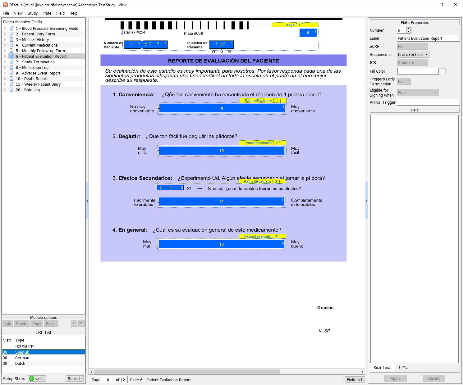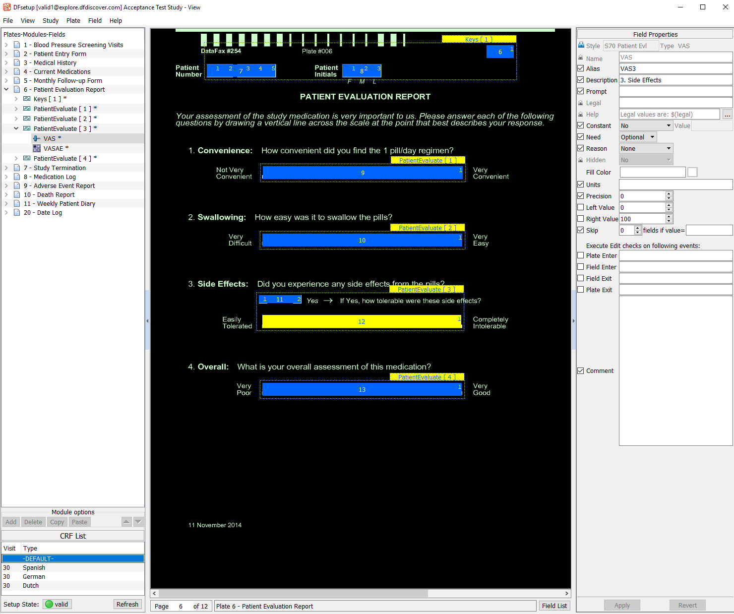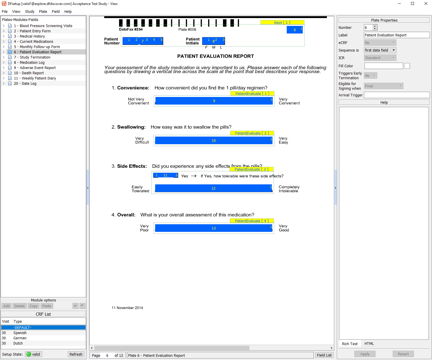Select the entry for 6 - Patient Evaluation Report from the list panel to make plate 6 the active plate. Examine the CRF List panel displayed in the bottom-left of the screen. Each entry represents a unique multi-language color background associated with plate 6. This study database has been defined to include colored, multi-language CRF backgrounds for plate 6, with the default background being black/white English. The default English background and some of these multi-language backgrounds were accessed previously in Section 2.4, “Open the Acceptance Test Study and verify the standard DFexplore views.”.