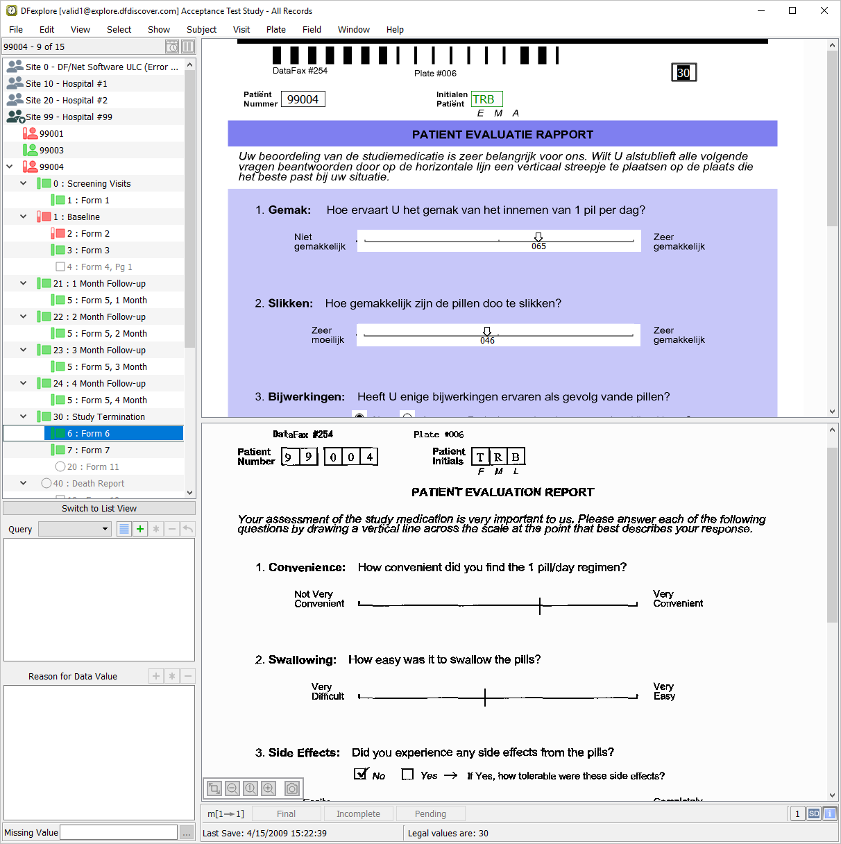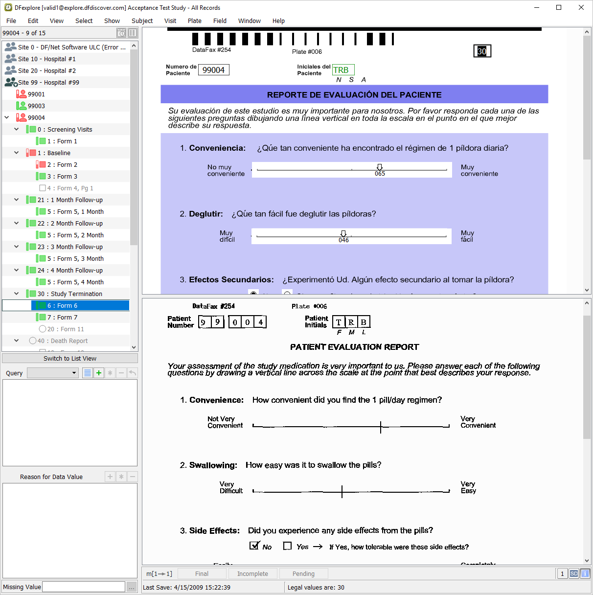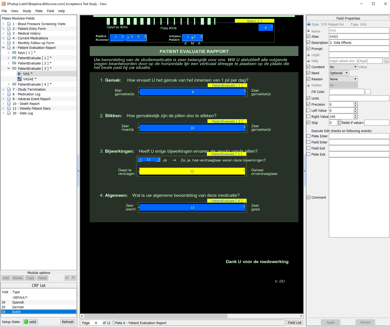 Select the entry for 6 - Patient Evaluation Report from the list panel to make plate 6 the active plate. Examine the CRF List panel displayed in the bottom-left of the screen. Each entry represents a unique multi-language color background associated with plate 6. This study database has been defined to include colored, multi-language CRF backgrounds for plate 6, with the default background being black/white English. The default English background and some of these multi-language backgrounds were accessed previously in Section 2.4, “Open the Acceptance Test Study and verify the standard DFexplore views.”.