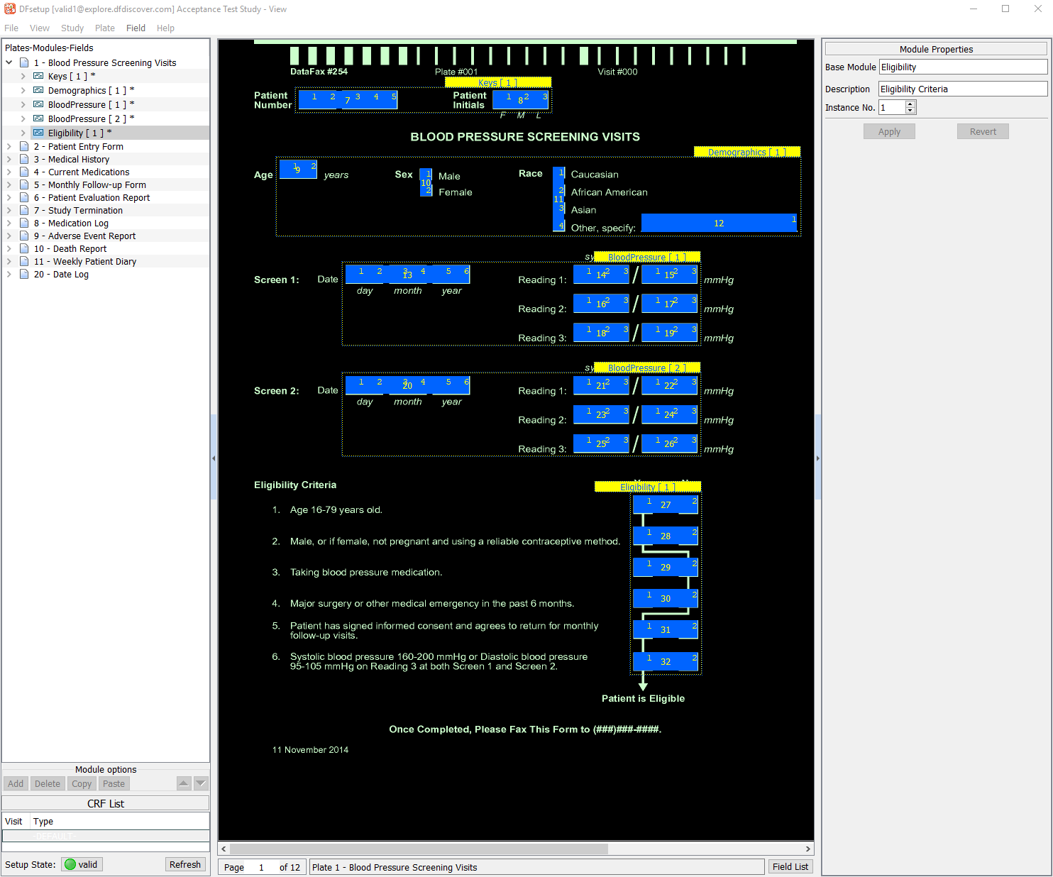Select any plate entry in the Plates-Modules-Fields list panel to make that plate the active plate. The main window is refreshed with the CRF view of the plate definition, which includes widgets for all modules and fields. Click any field widget on the current plate to make that field the active field.
