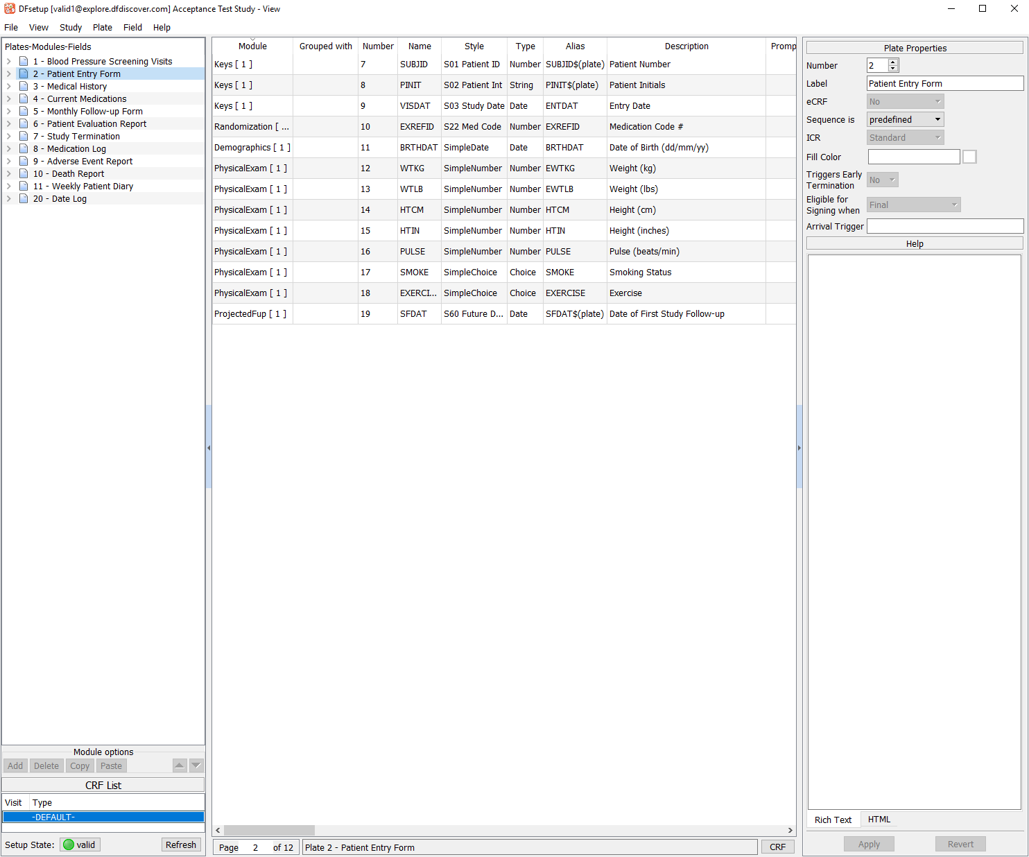 Select the 2 - Patient Entry Form entry from the list panel to make plate 2 the active plate. Click to replace the CRF view with a listing of all plate 2 fields and their properties. Click to return to the CRF view of plate 2.