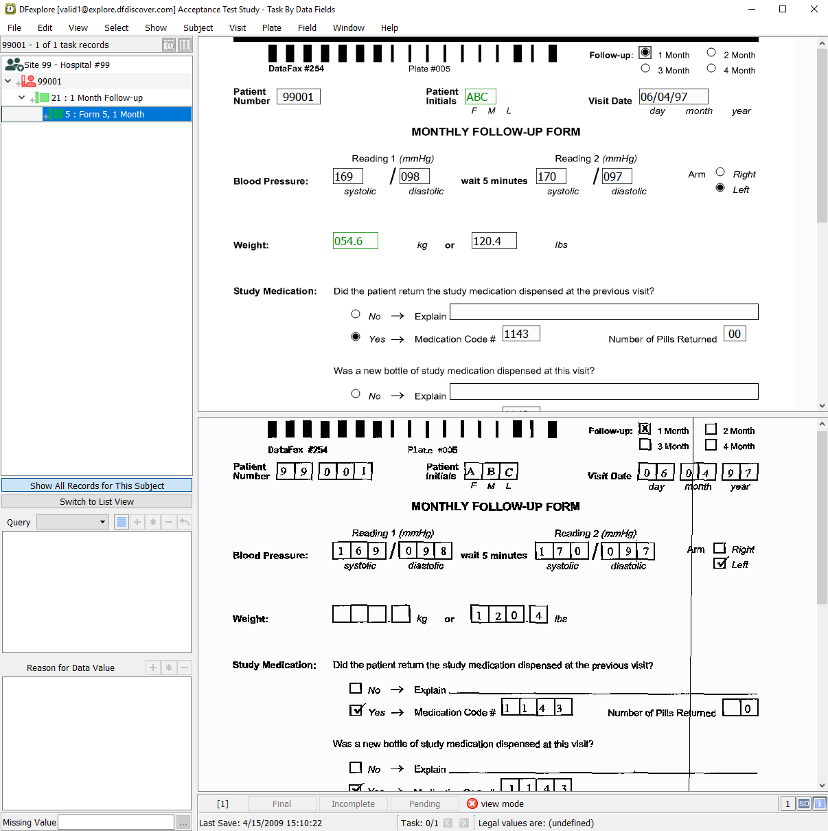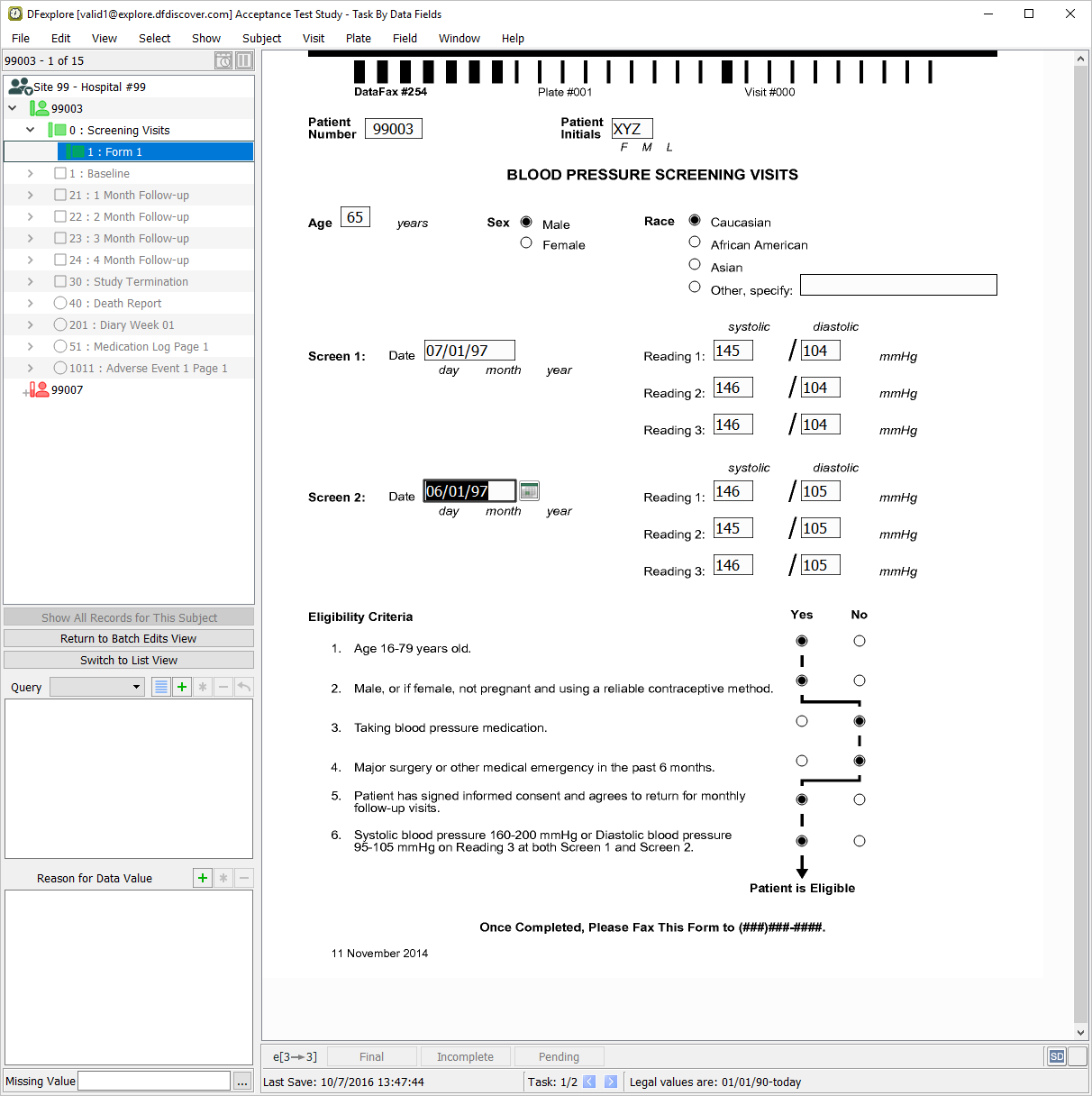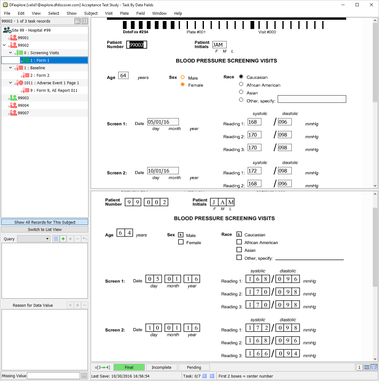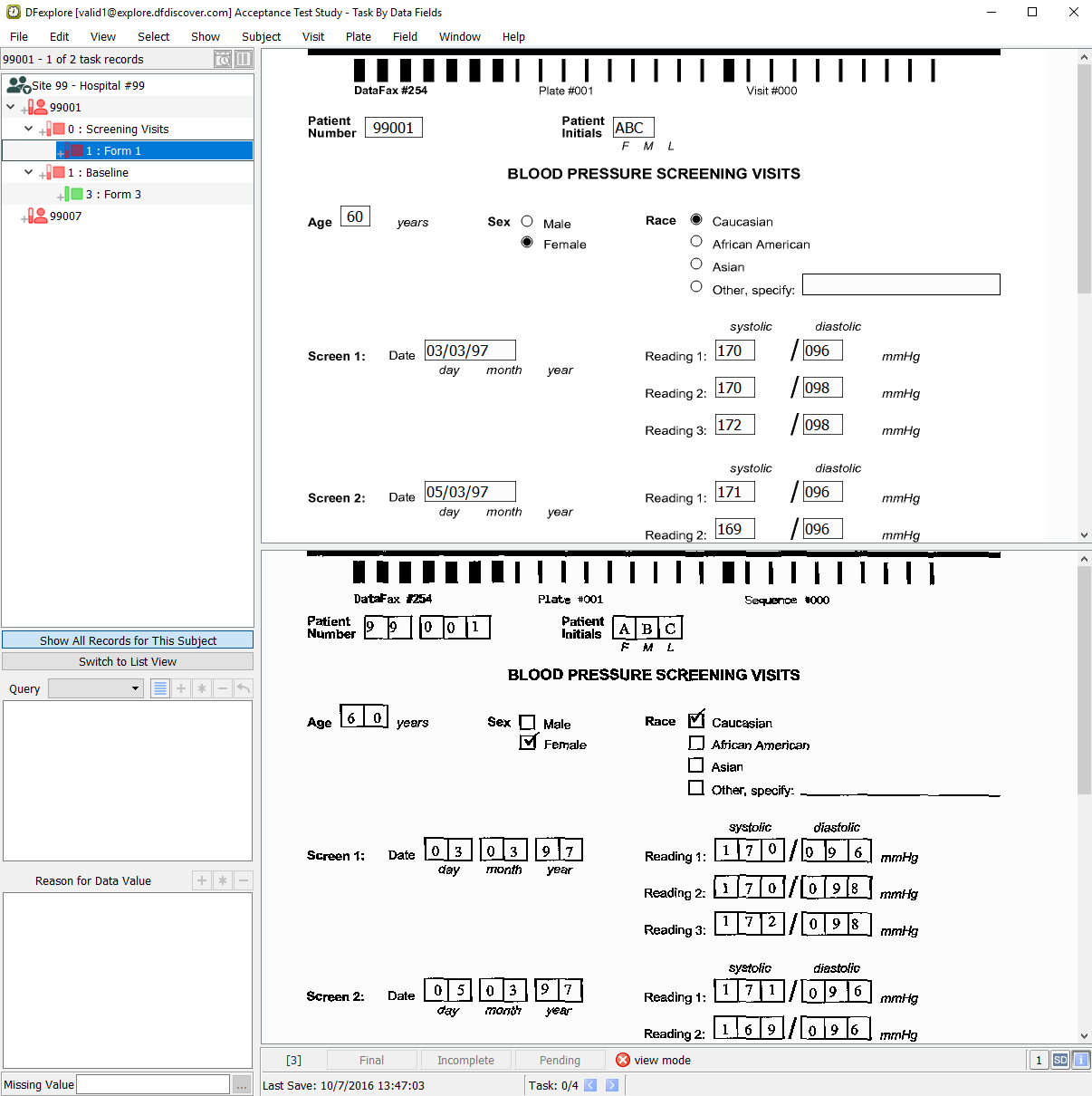 Double-click Subject 99007 entry in the record list to open task records for this subject. Press Tab to advance through the fields until Screen 1, Reading 1 systolic blood pressure becomes the current field.