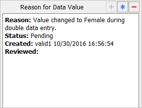 With the Adverse Event Report as the current page, click anywhere in the data entry screen background to make the page active. Press Tab to advance though the fields until the Description field becomes the current field. Select > . Examine the information in the dialog.