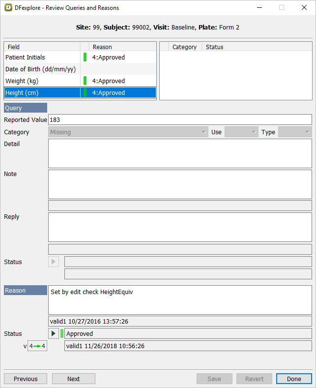 Select 4th Reason entry Height (cm). Confirm that the Status is set to Approved and
