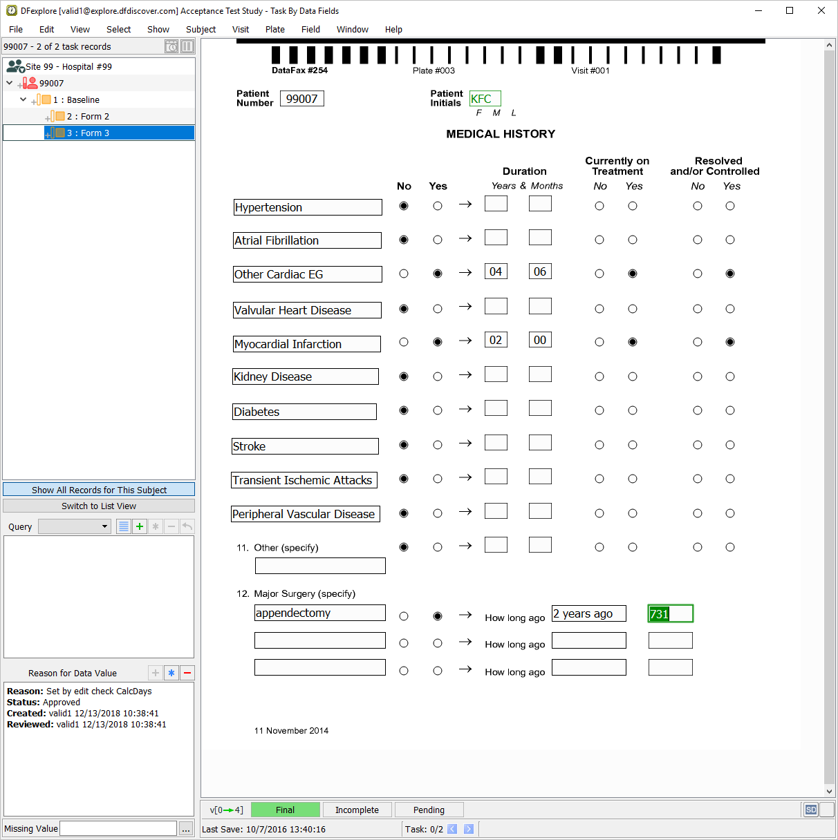 Select Subject 99007 > 1 : Baseline > 3: Form 3 from the record list and click anywhere on the page background to make it the active page. Beginning with the Patient Number field, Press Tab to advance through the fields until the first Major Surgery text field is the current field. Enter all Major Surgery information as it appears on the printed Medical History CRF page for Subject 99007. Press Tab to exit the last data field to make the save buttons active at the bottom of the screen.