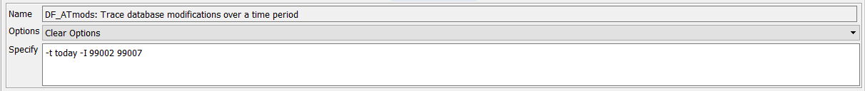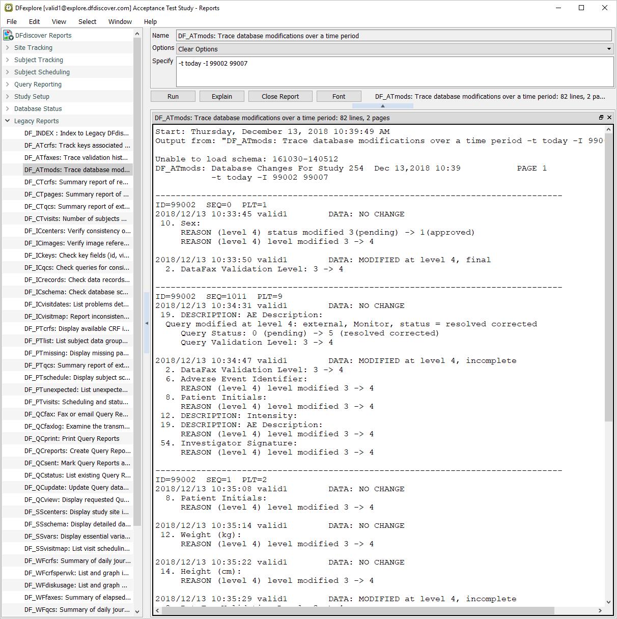 Double-click the Legacy Reports section and choose report DF_ATmods from the list of reports. To review all data modifications made to Subject 99002 and 99007. Enter -t today -I 99002 99007 in the Specify field.