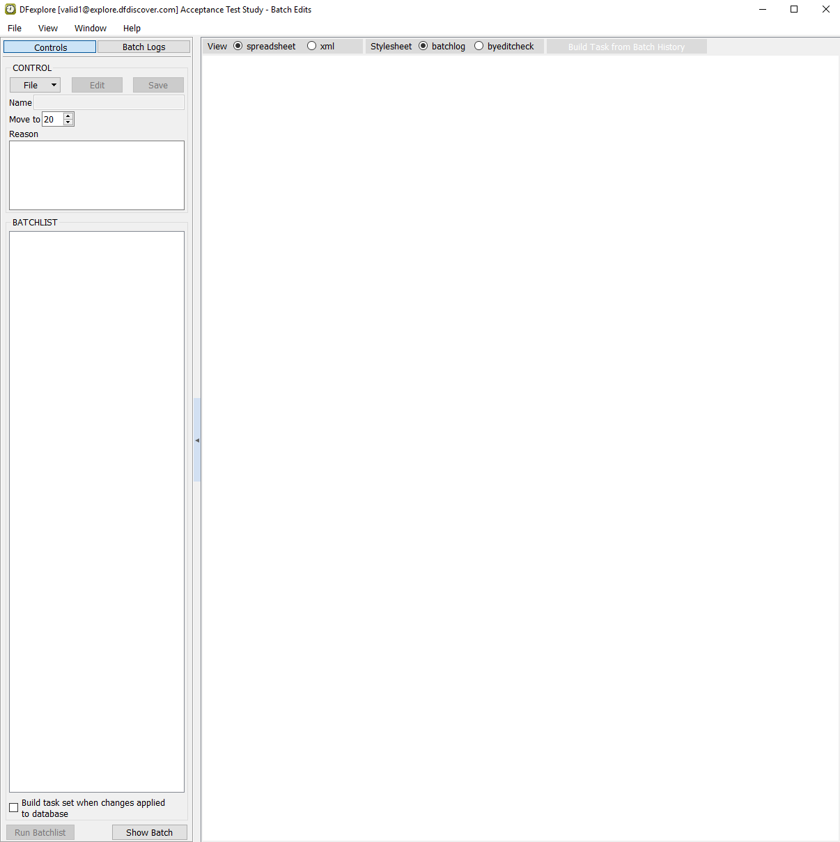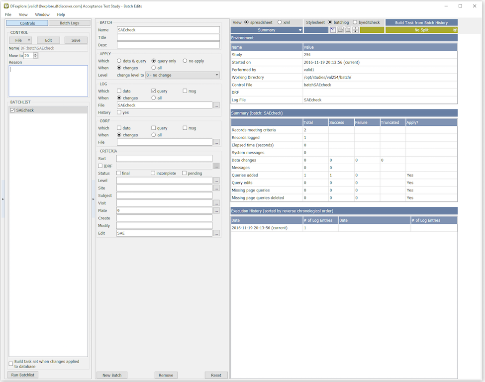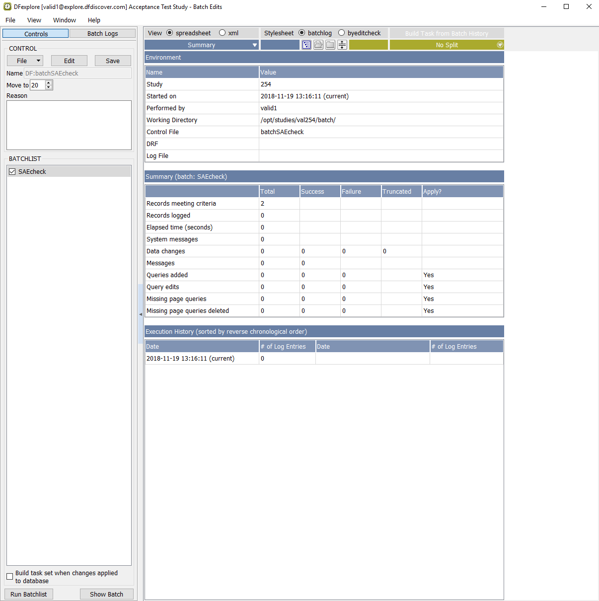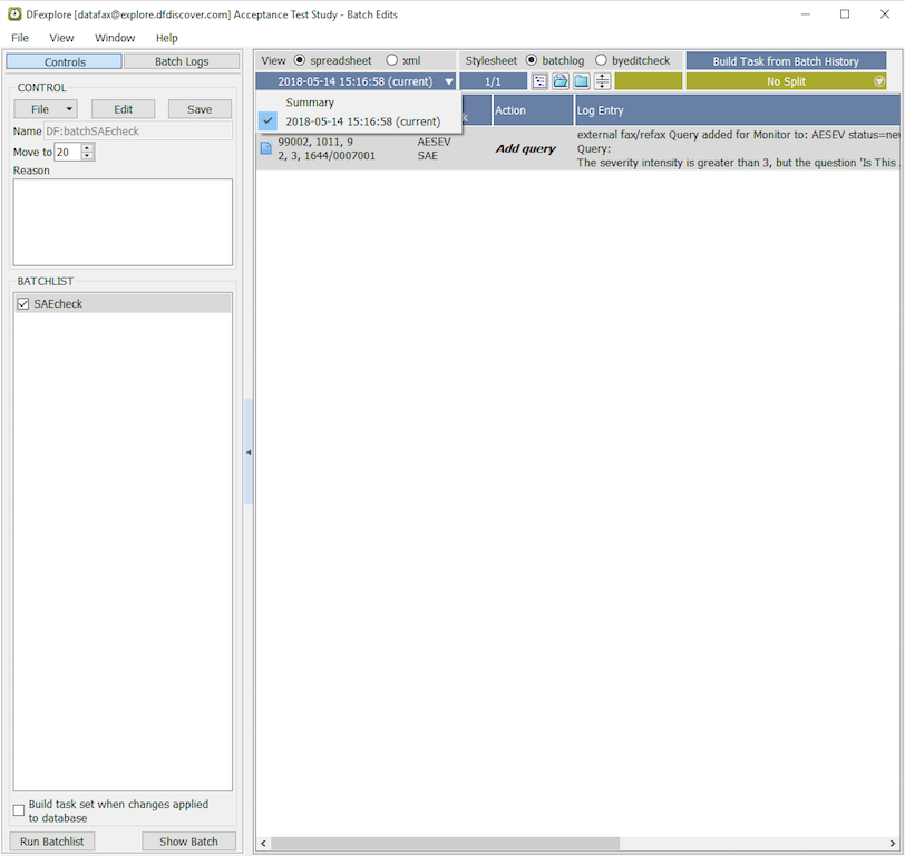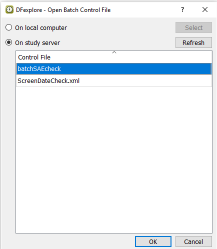 In the Open Batch Control File dialog, select (enable) the On study server option to display a list of available control files that are located on the study server for the 254 Acceptance Test Study. Choose batchSAEcheck from the list and click to load the control file.