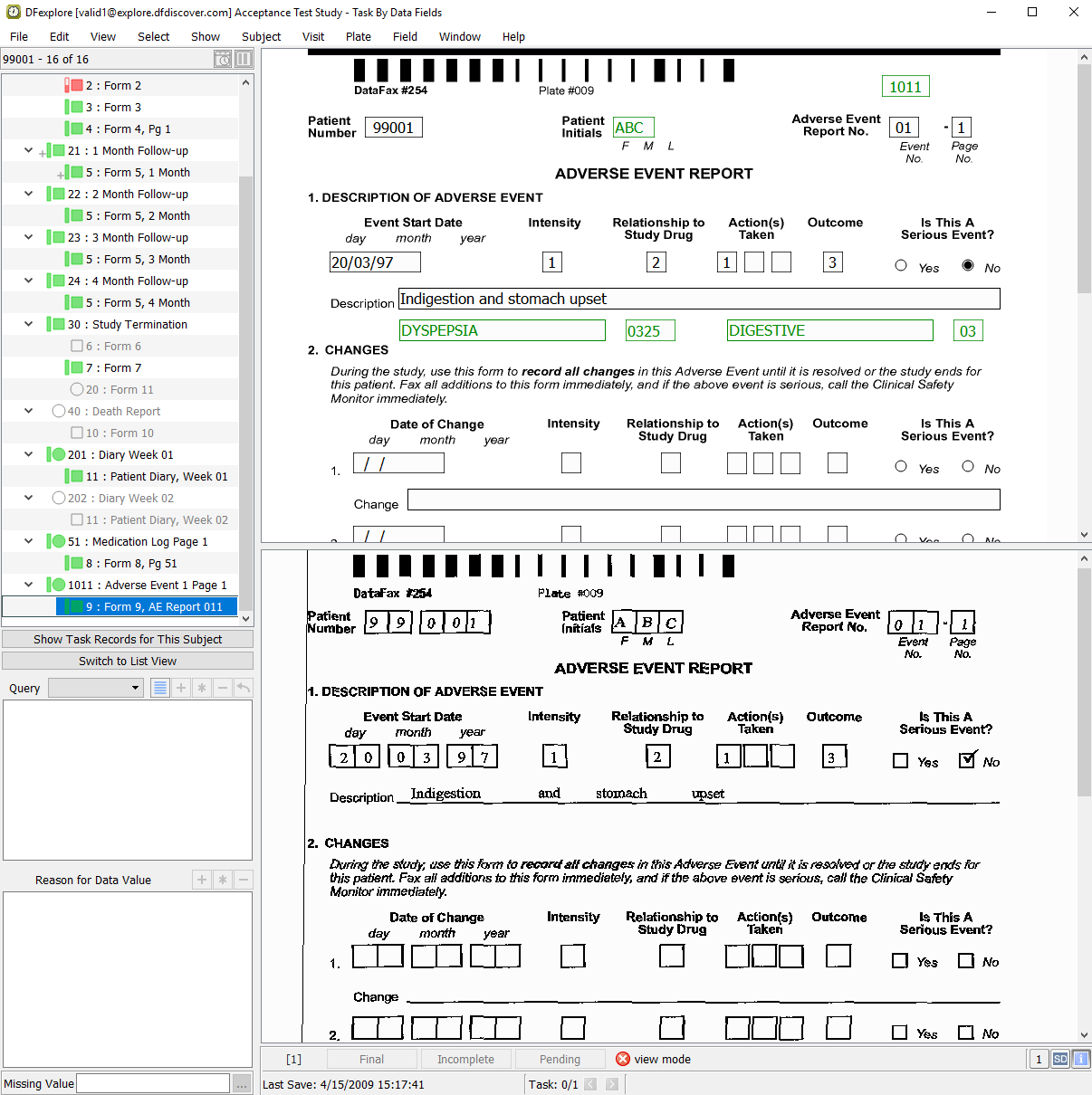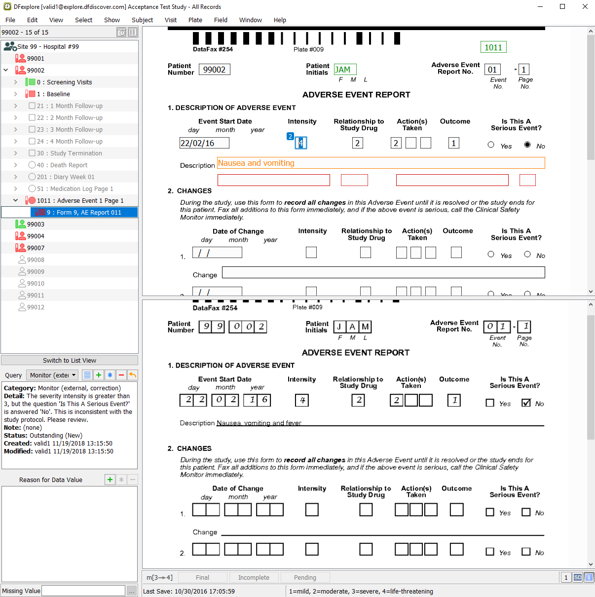 Confirm that a corresponding adverse event report has been submitted for Subject 99001. Do this by clicking located below the subject binder list. Scroll through the list of assessments until the 1011 : Adverse Event 1 Page 1 entry is located. Select page entry for 9: Form 9, AE Report 011.