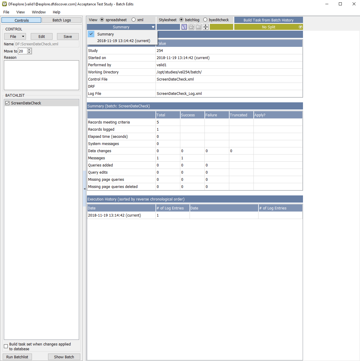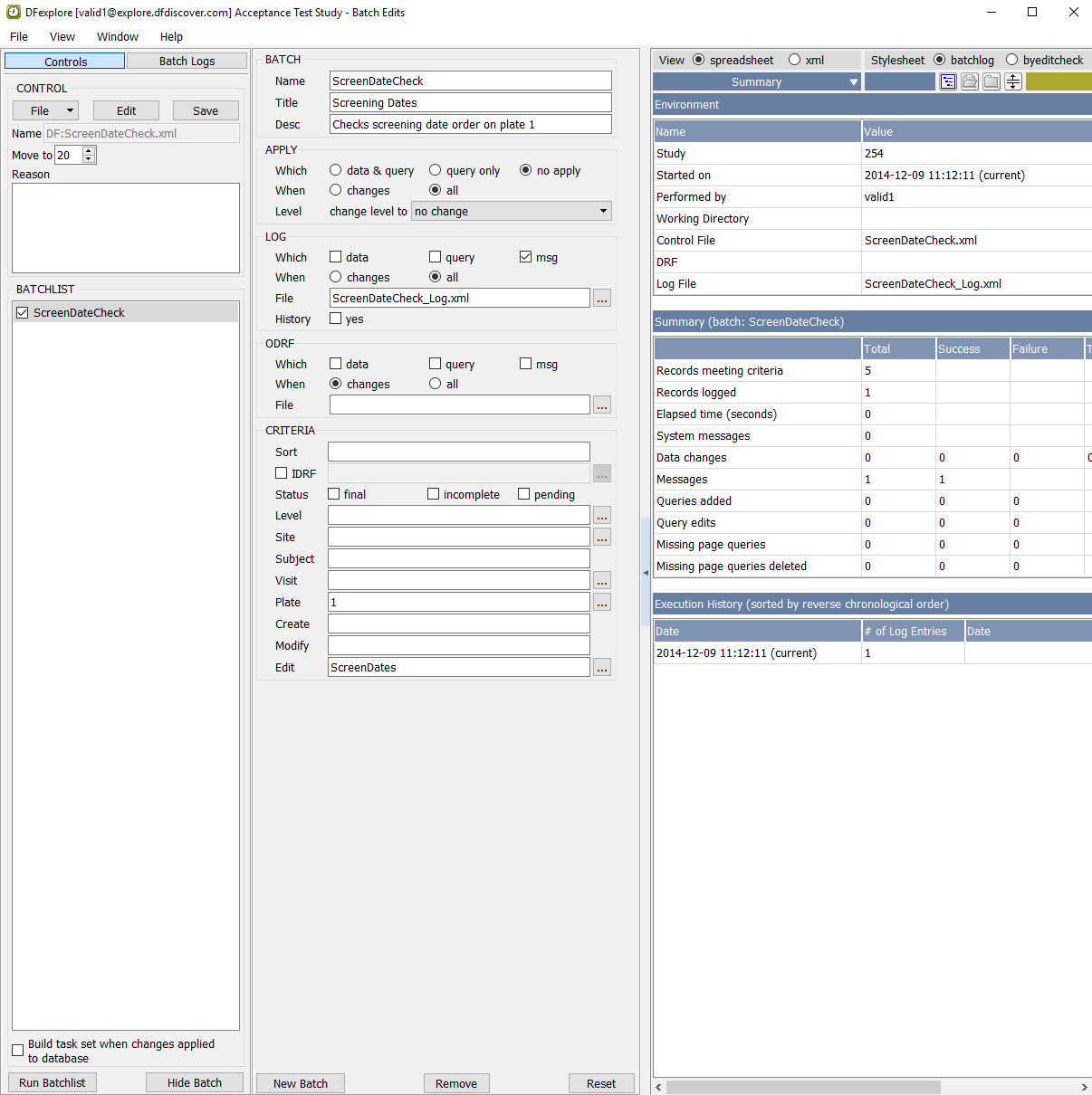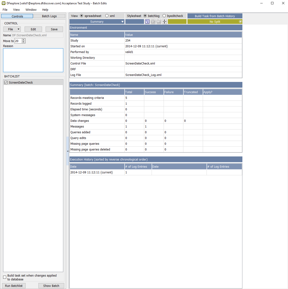 In the Open Batch Control File dialog, select (enable) the On study server option to display a list of available control files that are located on the study server for the 254 Acceptance Test Study. Choose ScreenDateCheck.xml from the list and click to load the control file.