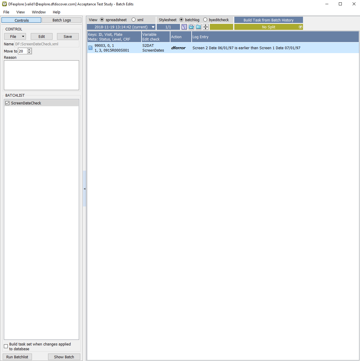 The ScreenDateCheck.xml control file executes the edit check |