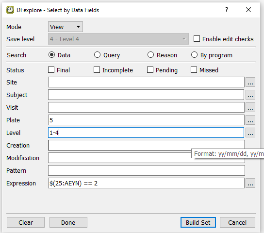 Do the following to build an expression that searches for the occurrence of adverse events: From the Field list in the Expression Editor, select 25:AEYN from Fields. From the Symbols list choose == equals. From the Codes list choose 2 Yes. Click to add the expression to the Expression field in the Select by Data Fields retrieval dialog.