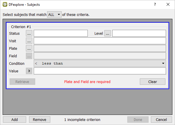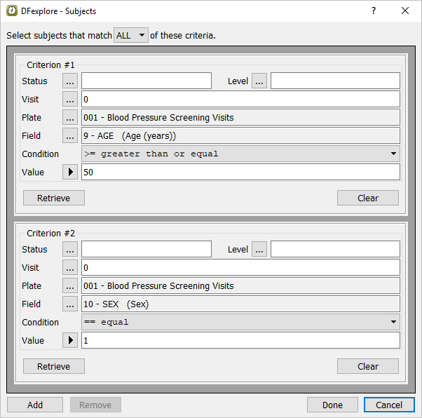 Click next to Field to get a listing of all fields defined on plate 1. Double-click entry SEX to populate the Field specification. Using the Condition drop-down menu, choose == equal to assign a retrieval Condition. Select 1 Male from the Value pull-down.