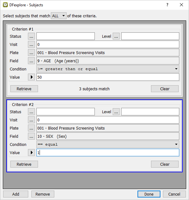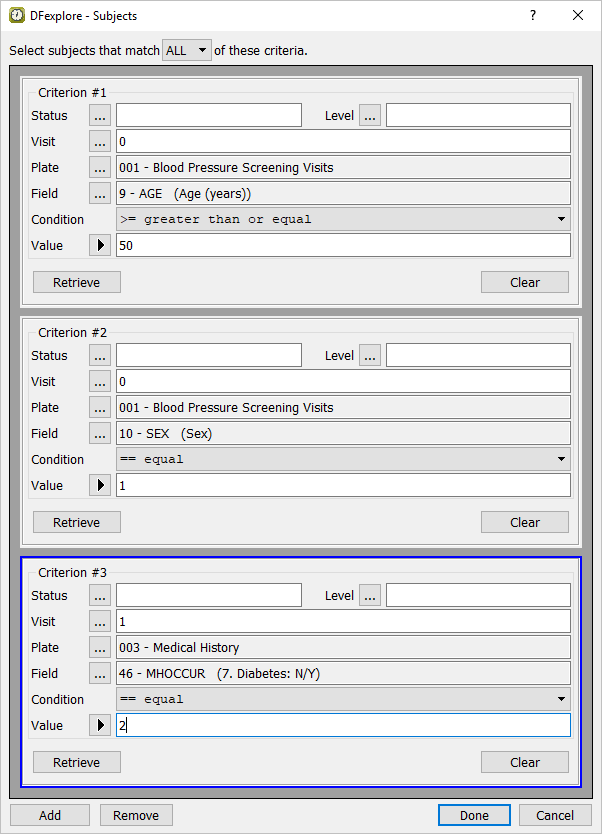 Click to retrieve the number of subjects that match the specified Sex criteria. Click to add a new criteria block in preparation for the specification of the 3rd retrieval criteria (history of diabetes).