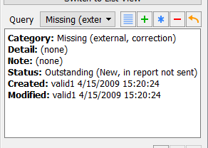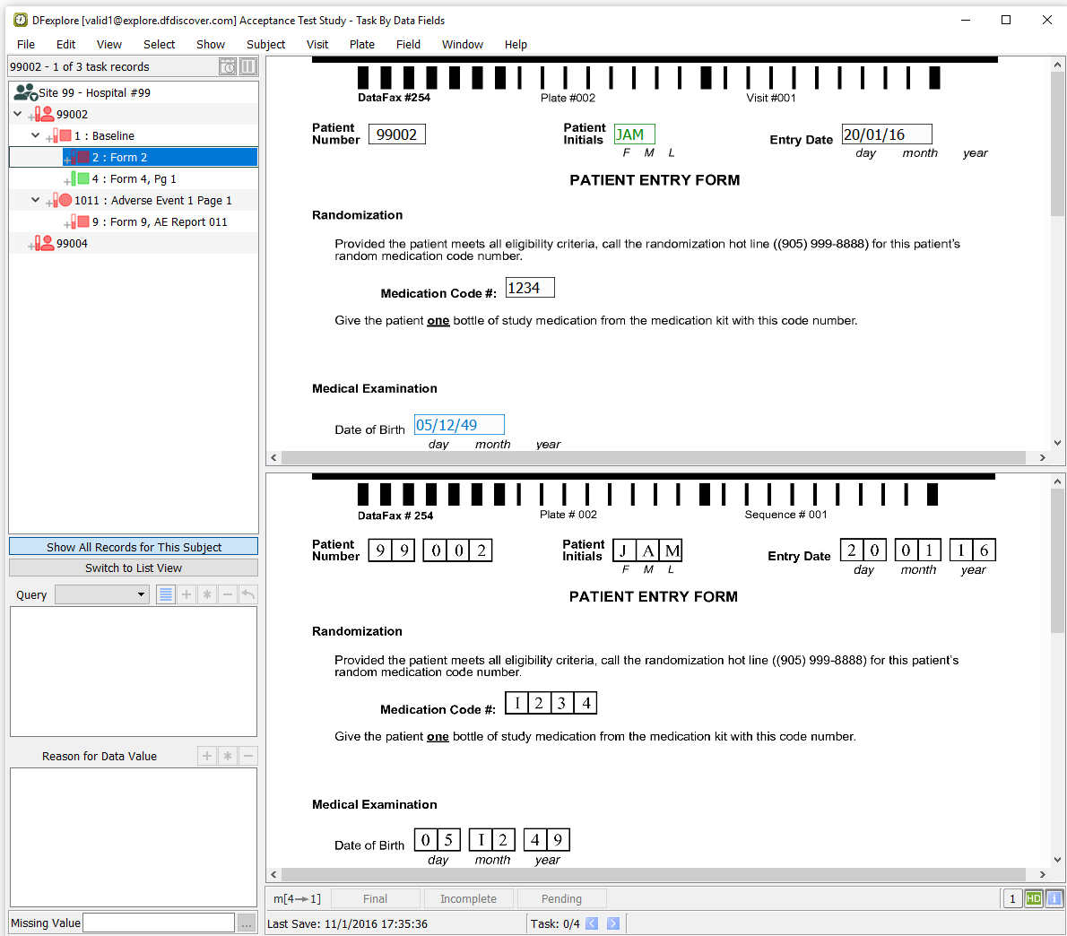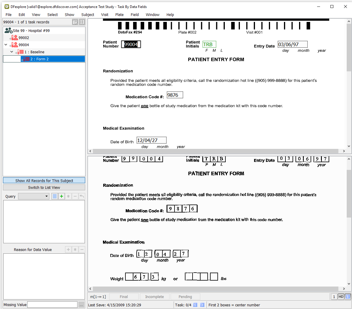 Highlight the 9: Form 9, AE Report 011 page in the page list. Press Tab to advance through the fields until the Intensity becomes the current field. Confirm that this field is blue and the QC count “2” is displayed on the field widget. Examine the Query window to view the details of the queries. Verify that the information in the Query window is consistent with the corresponding printed Query report.