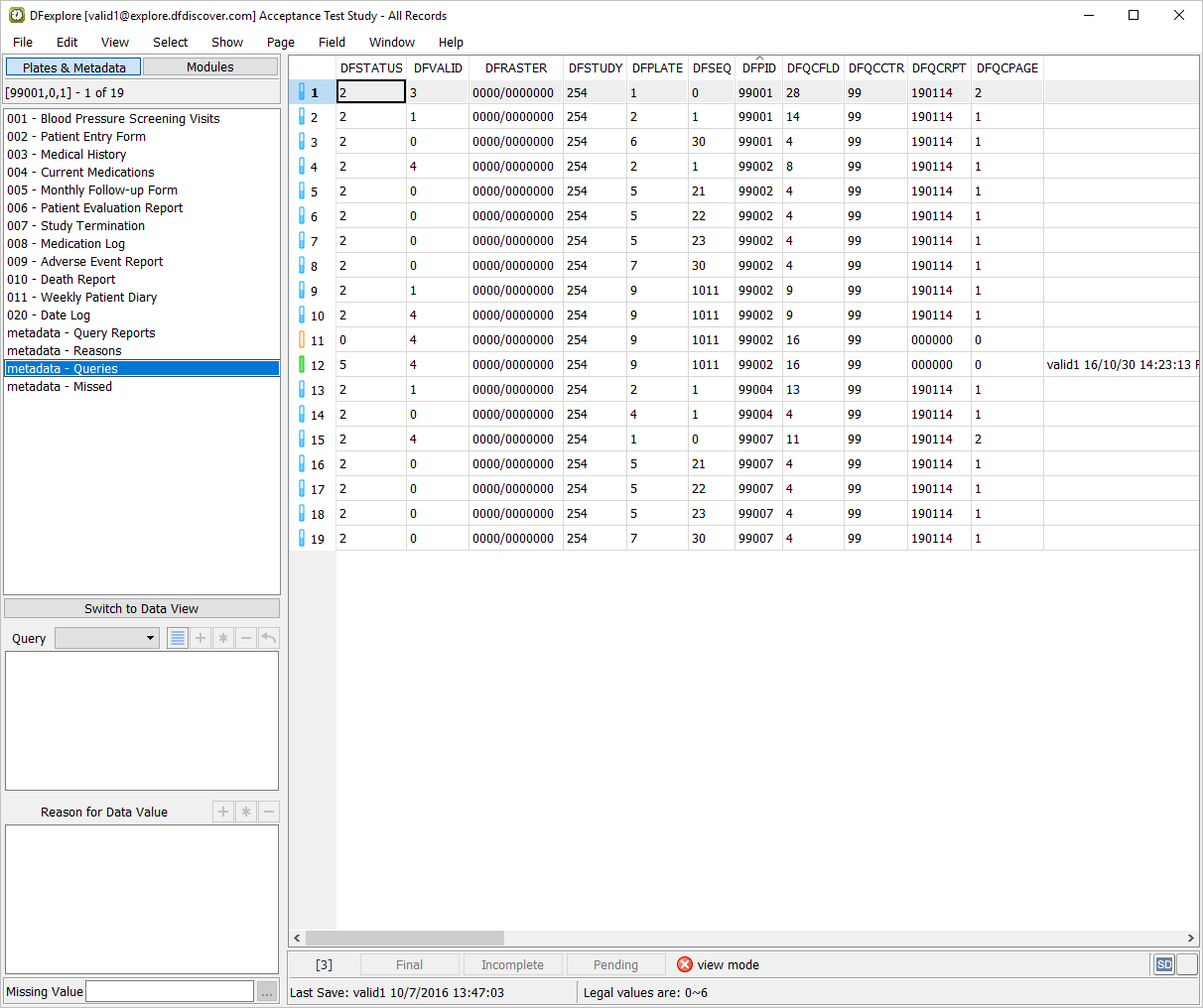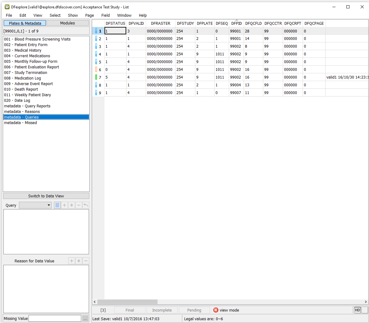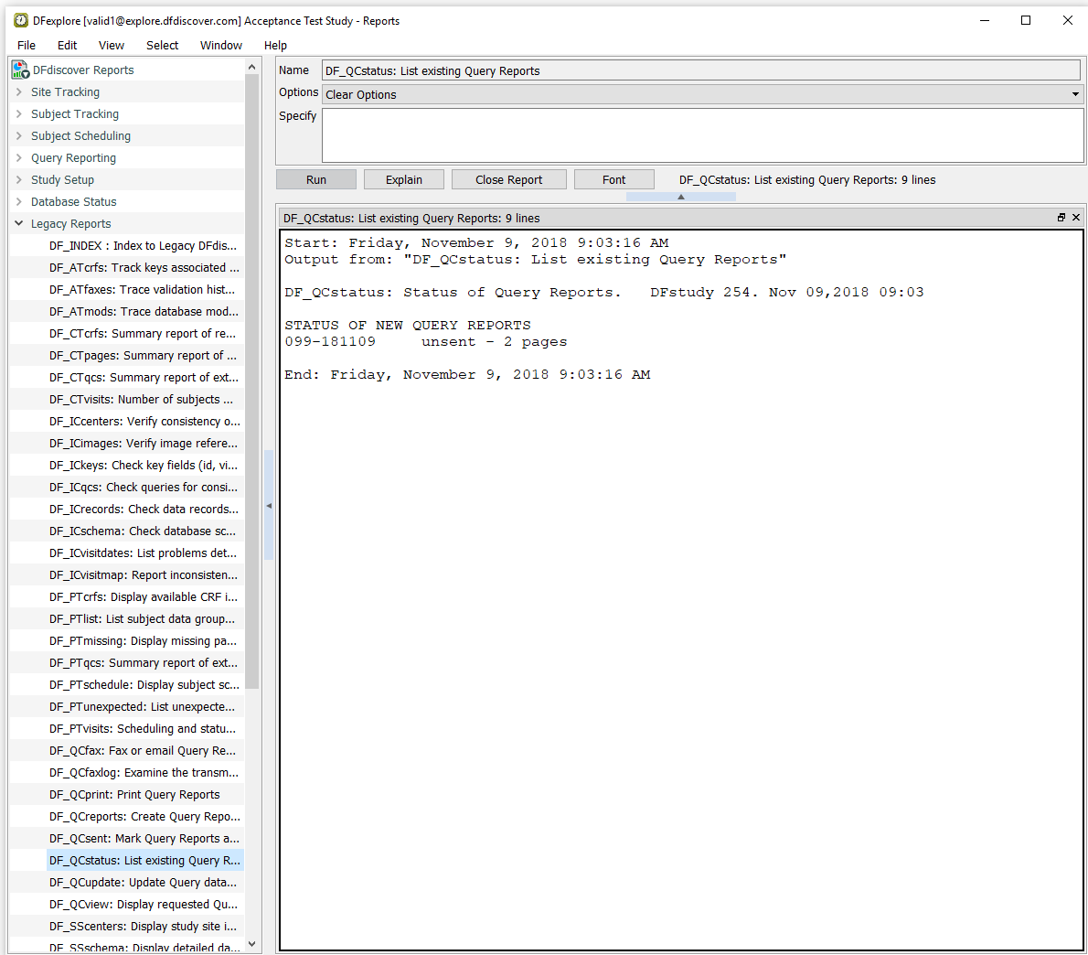 Start DFexplore and login to the 254 Acceptance Test Study as described in Section 10.3, “Obtain database query metrics and details using Status and List Views to review all outstanding queries prior to query report creation.” as user valid1.