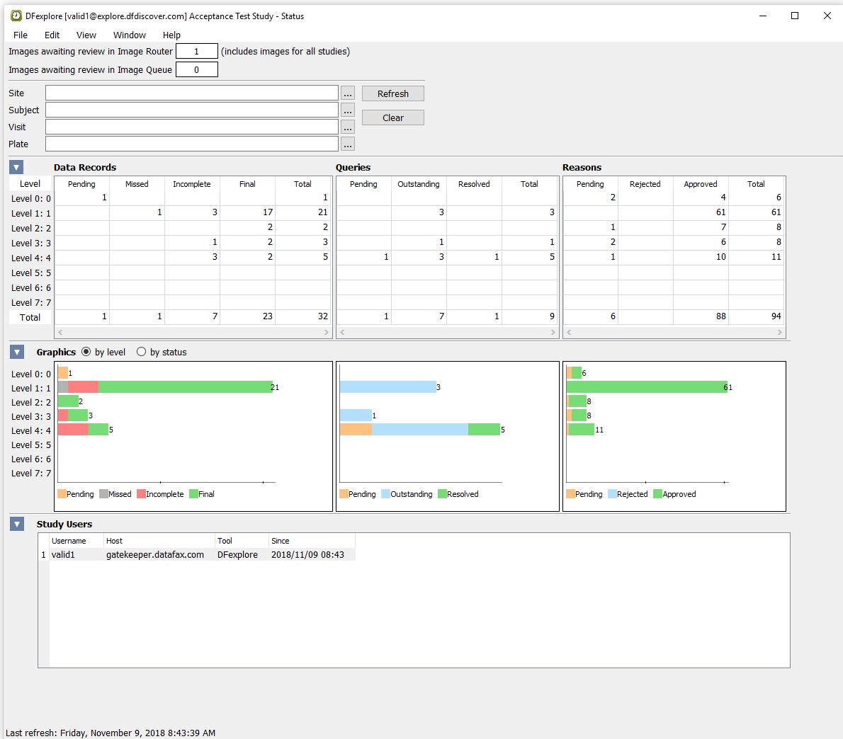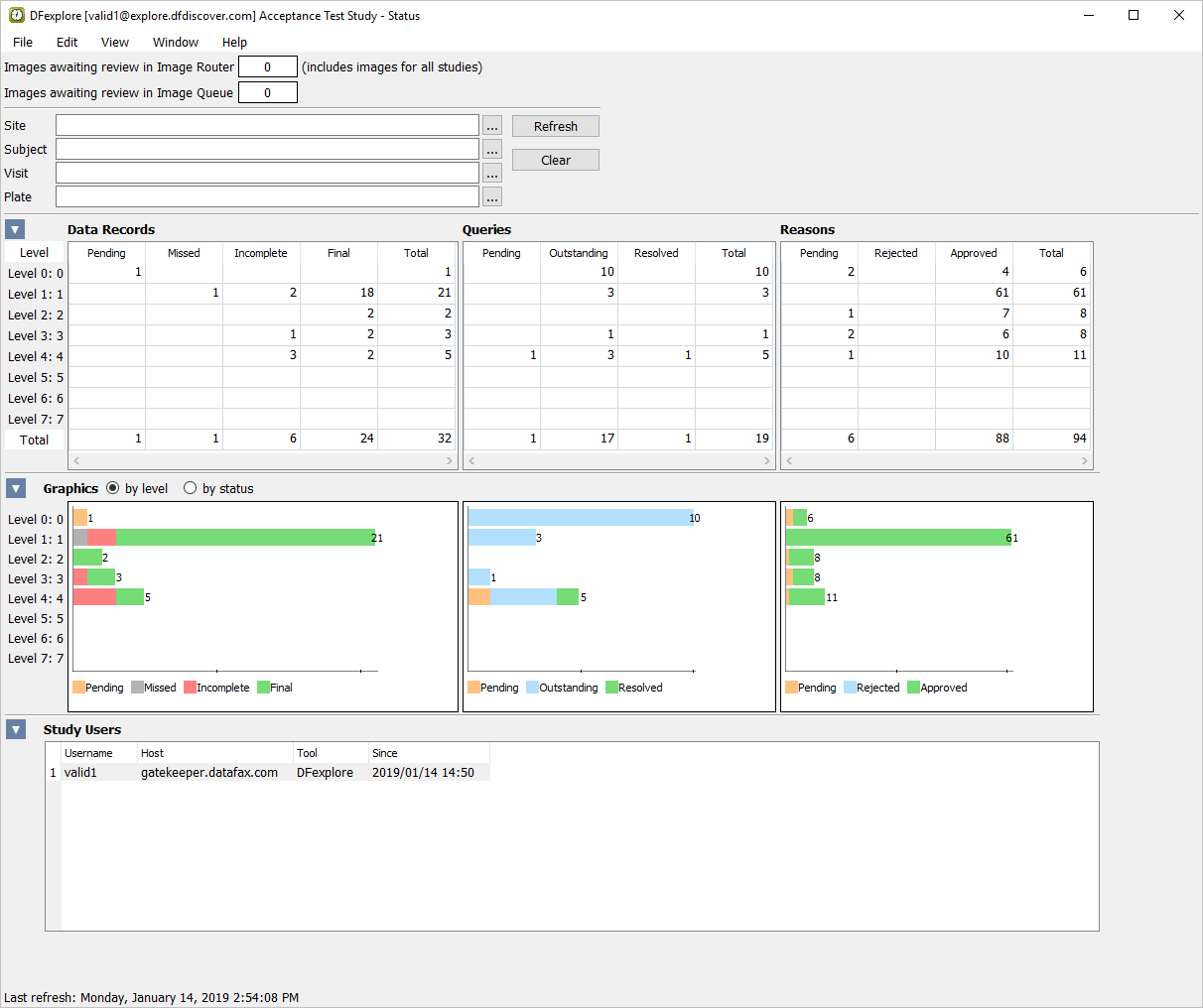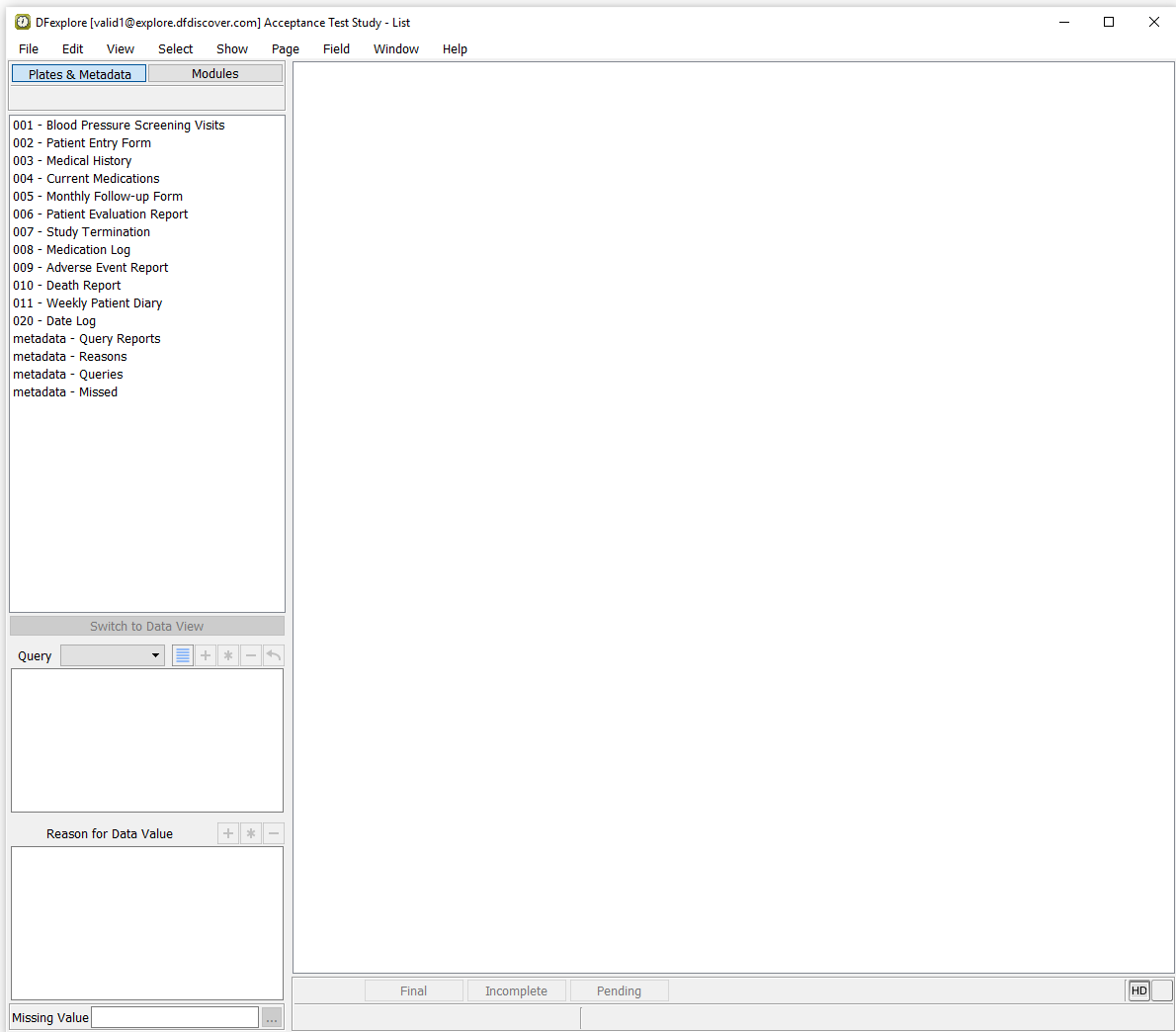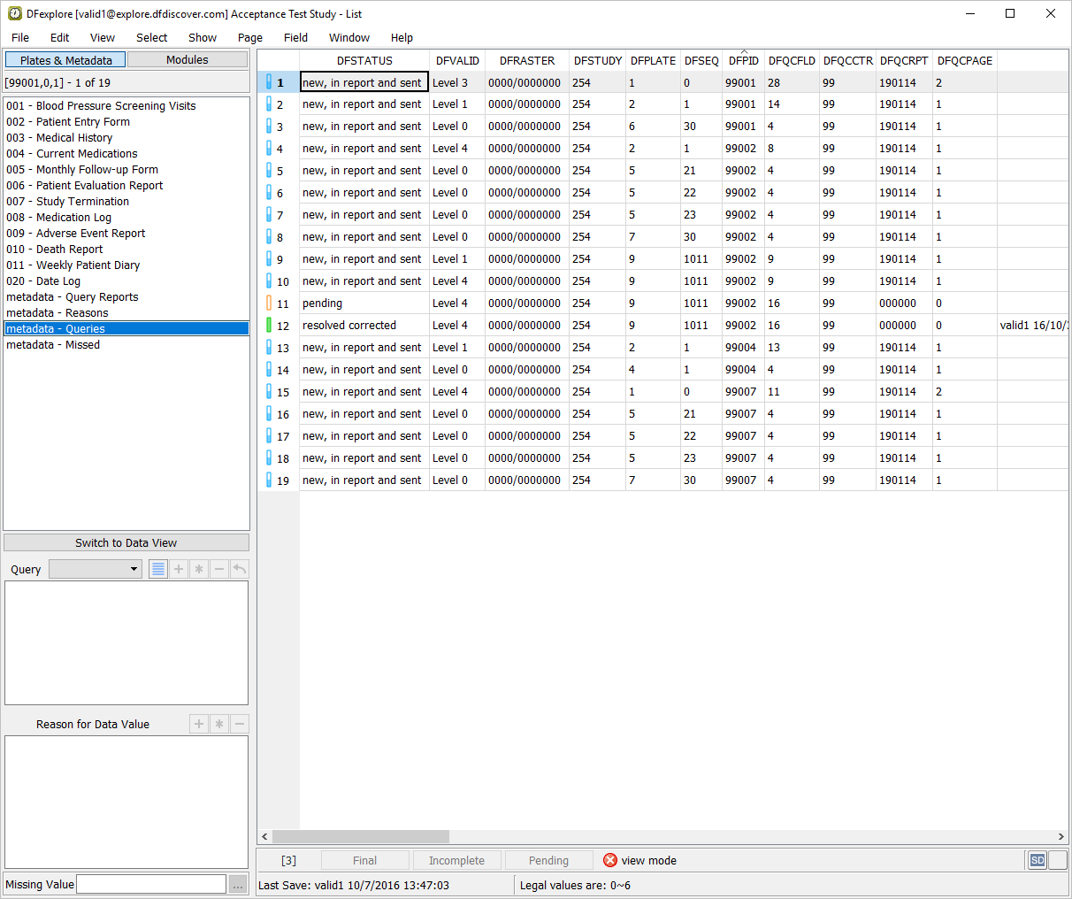 Start DFexplore and login to the 254 Acceptance Test Study as described in Section 10.3, “Obtain database query metrics and details using Status and List Views to review all outstanding queries prior to query report creation.” as user valid1.