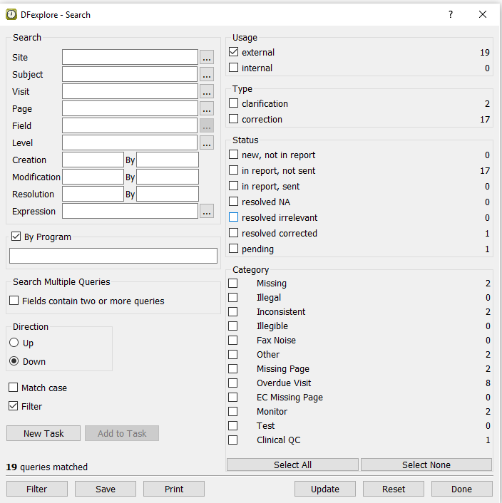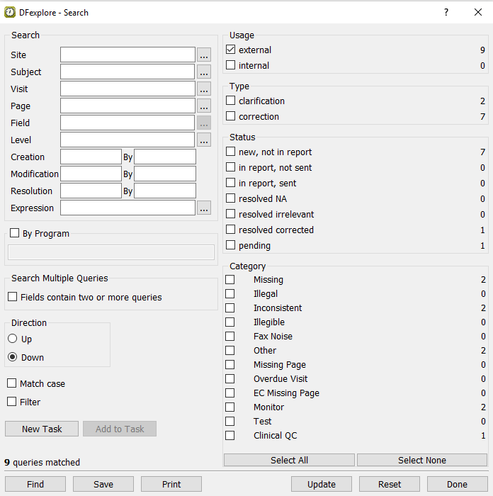Select > to specify a set of query search criteria. In the resulting search dialog, select (enable) Usage = external. Click to update the dialog with details and a count of external queries.