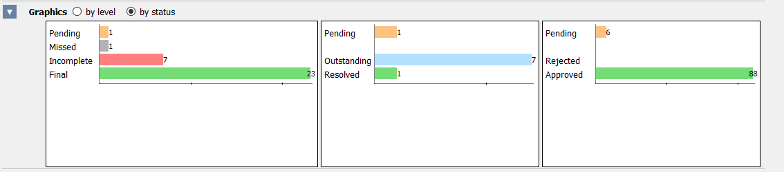 Open the Graphics section and select the toggle button for by status. Confirm the count of Pending and Outstanding queries.
