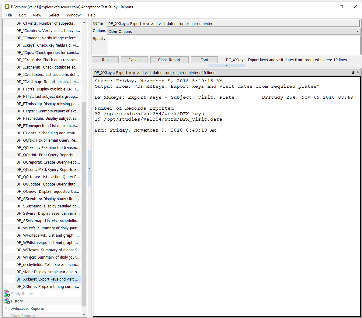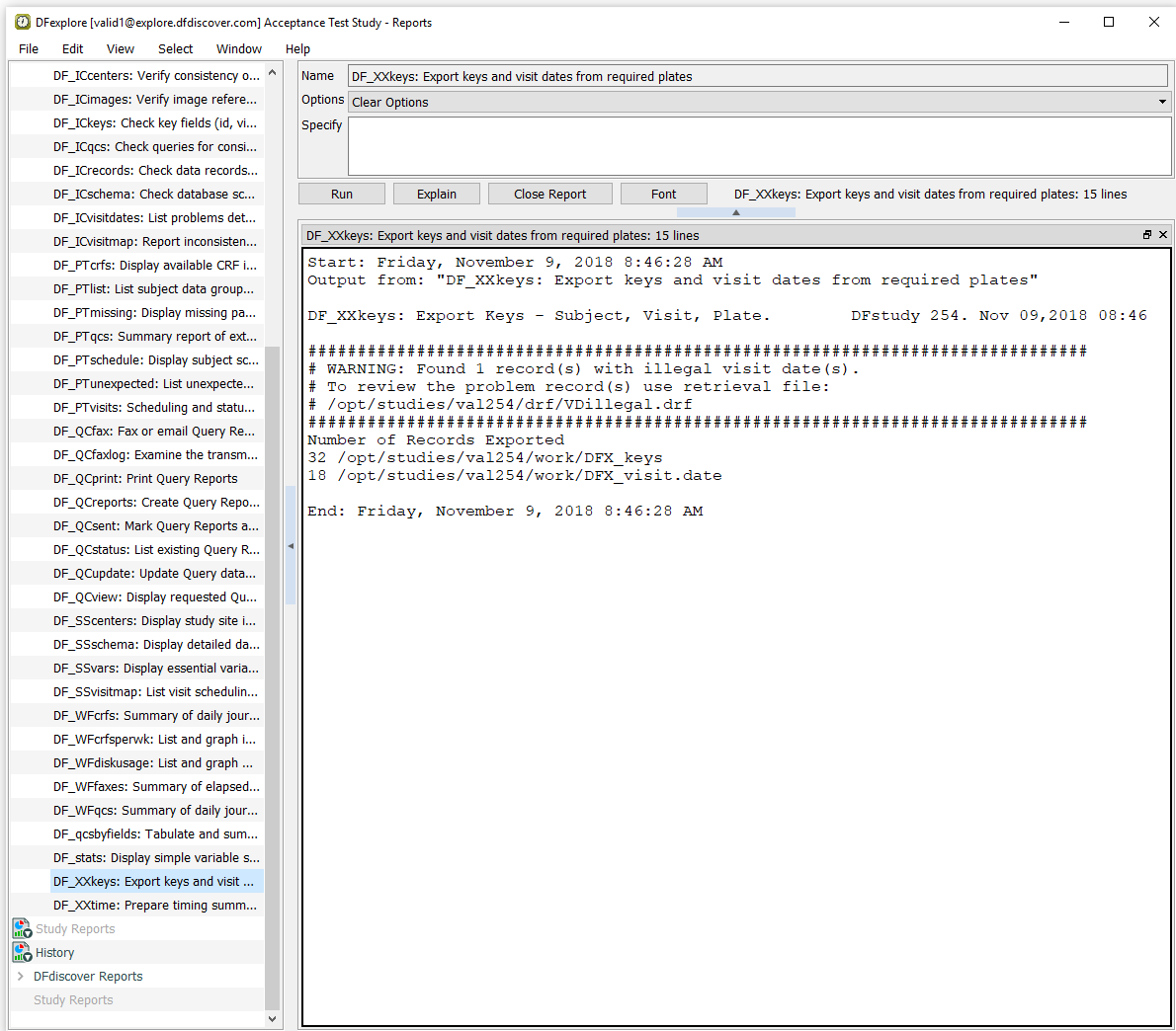 Select > to return to Reports View. Again choose the report name DF_XXkeys from the list and click button. Confirm that the output no longer reports illegal visit dates.