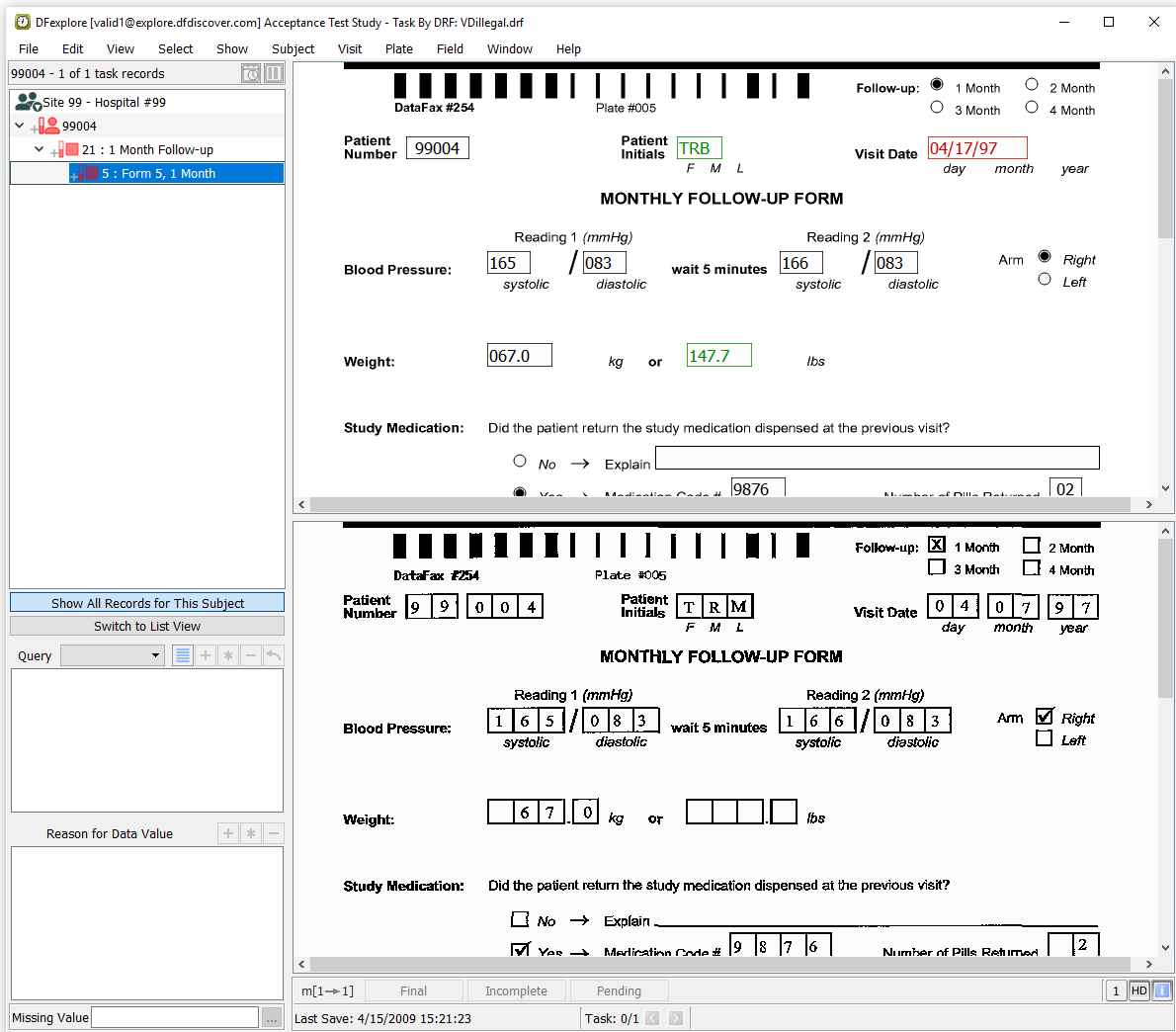 For this test you will need to reference the query report printed in Section 10.11, “Execute DF_QCprint to print the query report from the QC/NEW directory.” to verify the information contained in the report against the study database. Three examples of queries will be verified in this test. You may choose to check the remainder of the notes yourself. |