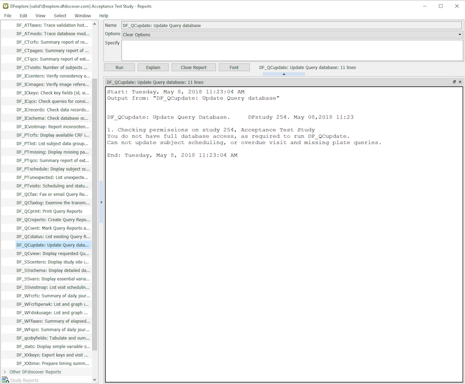 Double-click DFdiscover Reports, expand Legacy Reports by clicking . Choose DF_QCupdate from the list of reports. Click to re-execute DF_QCupdate with the correct database permissions.