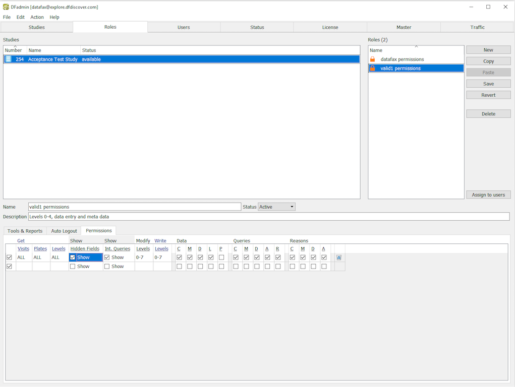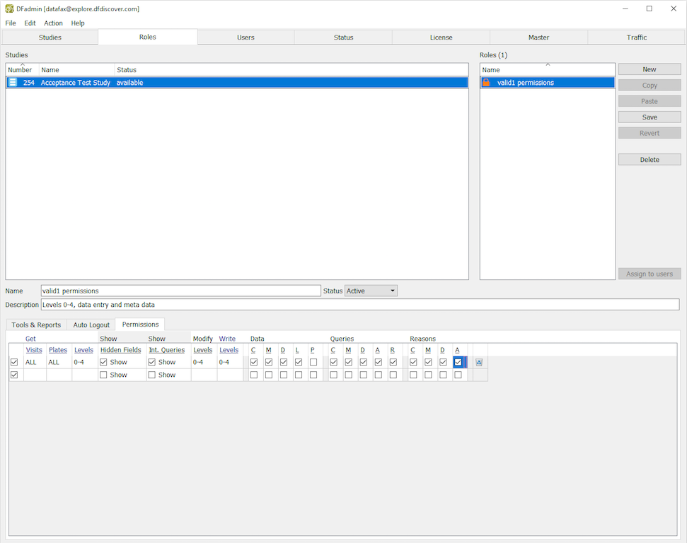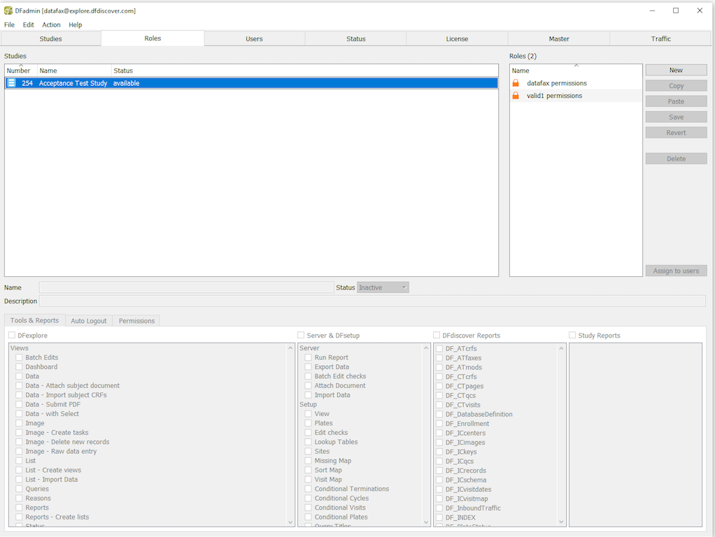 In DFadmin, select the Roles tab to open the Role definition window. Select 254 Acceptance Test Study from the list of studies.