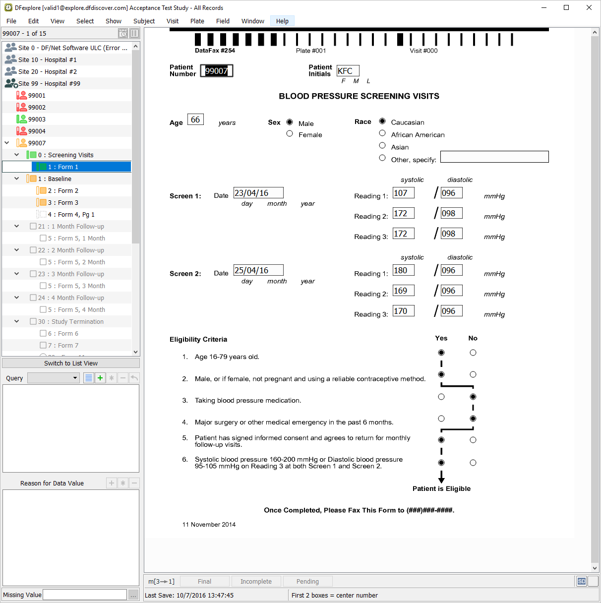 Click to apply the query to the Screen 2, Reading 1 systolic blood pressure field. Note that the field becomes blue. Examine the details in the Query window that appears near the bottom left of the screen.