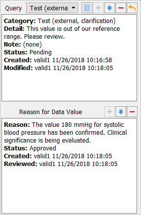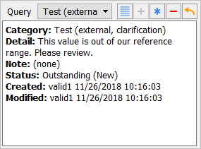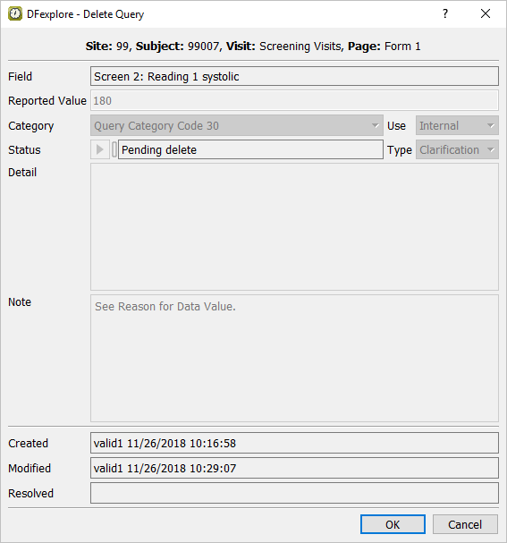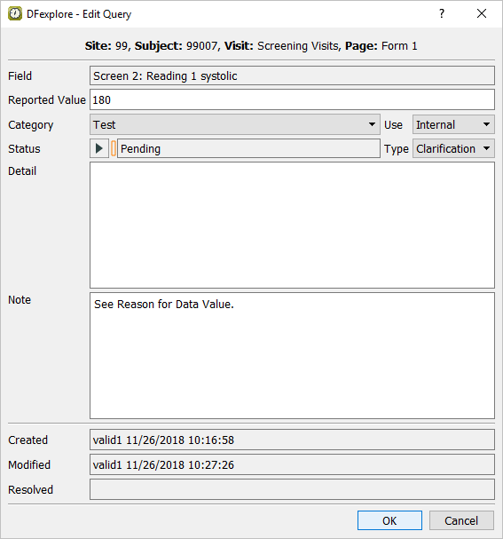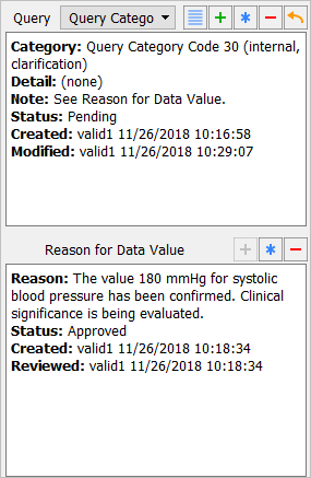 If a user-defined Query Category Code is specified as auto-resolution in DFsetup, adding a reason to a field that has a query with such a problem type will change the query status from outstanding to pending. |