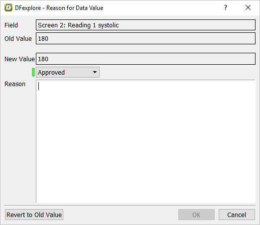 Click to apply the reason to the Screen 2, Reading 1 systolic blood pressure field. Note that this field is the current field and the field becomes orange. Examine the details in the Reason window that appears near the bottom left of the screen.