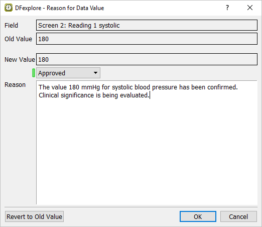 Enter The value 180 mmHg for systolic blood pressure has been confirmed. Clinical significance is being evaluated. in the Reason field.
