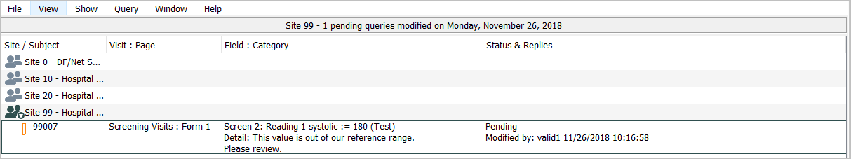 Select > . Select > to display all pending queries for Site 99 - Hospital #99.