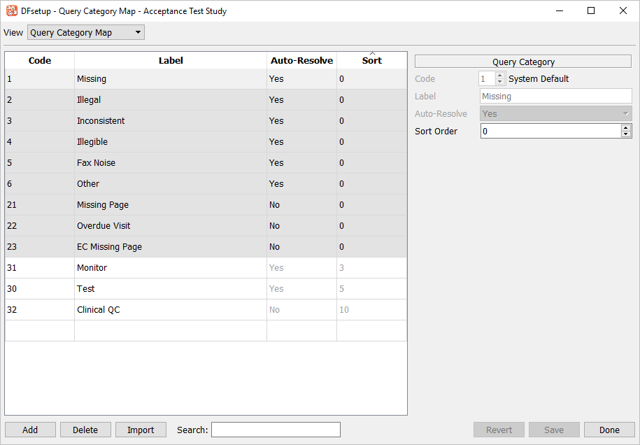In the Query Category Map dialog, locate the entry that has Query Category Code 30 and Label Test. Click entry to highlight it, then click . Click and .