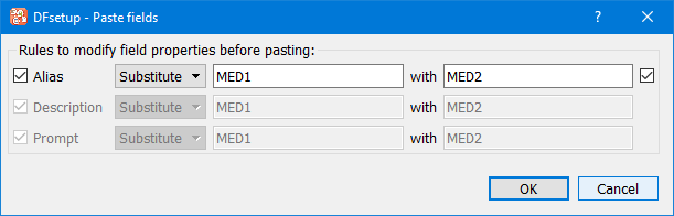 In this example, all instances of 'MED1' in the copied fields properties are replaced with 'MED2' in the pasted fields.