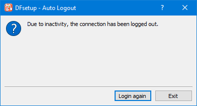 If a DFsetup session does auto logout a dialog that allows the user to re-connect easily is presented.