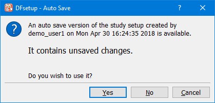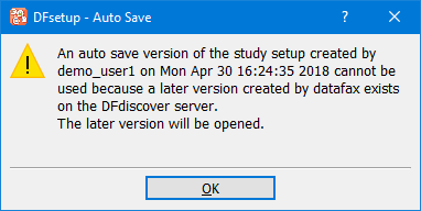 If the computer you use to run DFsetup has an auto save file for the specific study, then regardless of who created it, DFsetup compares the auto save file with the version of the study setup saved on the server. If the version saved on the server is newer than the auto save version, a warning message is displayed and the auto save file is removed.