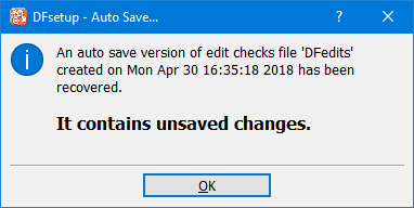 For additional protection, DFsetup does, at the specified time interval, create an auto save file for the current study setup, edit checks and lookup tables, in a temporary directory on the local computer. The auto save file is created and updated whenever there are changes that have not yet been saved to the study server. An auto save file is also created, if there are any unsaved changes, immediately before an auto logout. The auto save file is removed when a > is successfully completed.