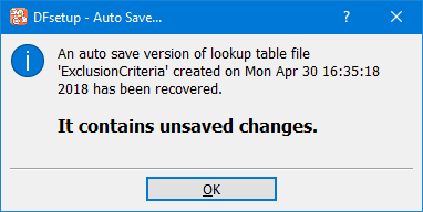 This notification appears if an auto save version of a lookup table file exists.