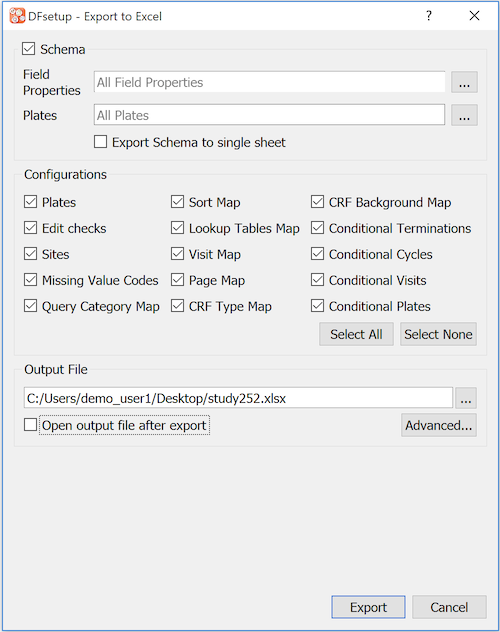 Schema. Indicate which field properties and plates are exported. By default, each plate definition is written to a separate worksheet. Select Export Schema to single sheet to override this default and write all of the plate definitions to a single worksheet. All field properties can be included, or a subset can be chosen from the sub-dialog available when clicking .