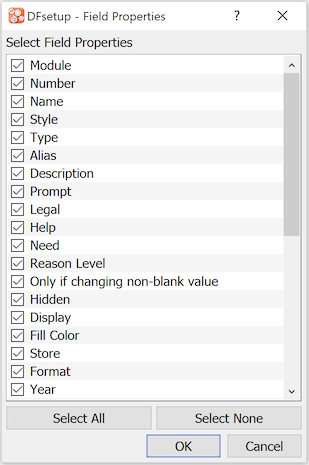 Module Properties - saves field properties for all or specified modules. Saves either a compact report containing just those properties defined at the module level, or a longer report containing all field properties, whether defined at module or style levels.