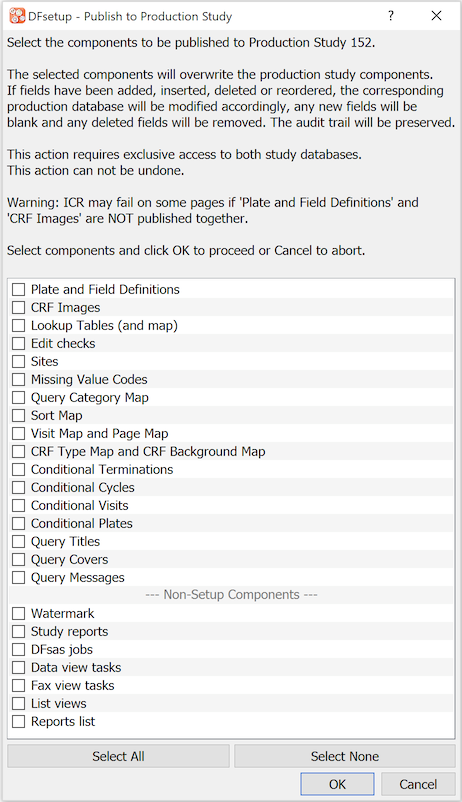 This option is used to copy all or selected setup files from the development study to the production study, including: 'Plate and Field Definitions', 'CRF images' (data entry backgrounds), custom level labels, and each of the configuration files. Publishing can only be successful if both the development and production studies have the same DFdiscover version of the study setup.
