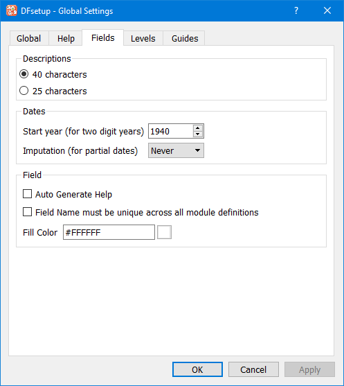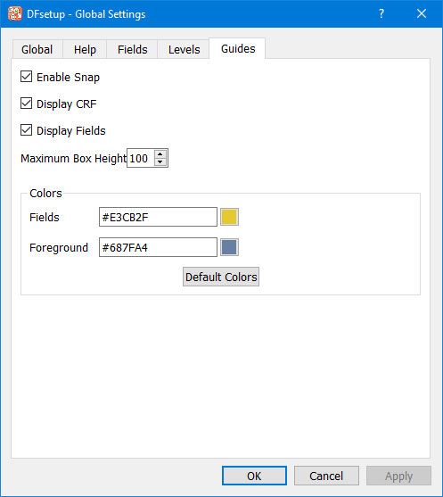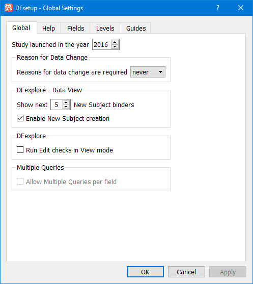 In the dialog, settings are grouped by purpose and presented in separate views under the tabs Global, Help, Fields, Levels and Guides.