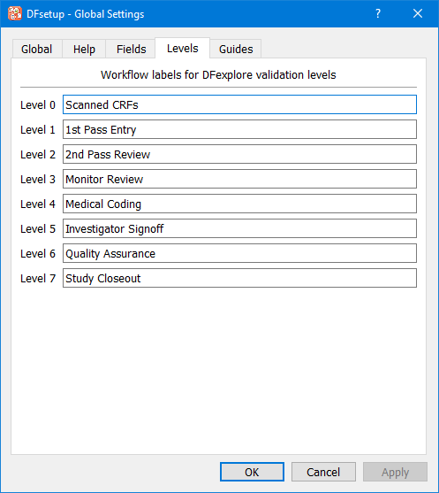 Labels can also be left blank when the workflow level associated with the label is not used. Where custom labels are used, they are included in DFschema as attributes for DFVALID, output as WORKFLOWLABEL in xml export file, and appear in DFexplore in all views where save levels are specified or displayed.