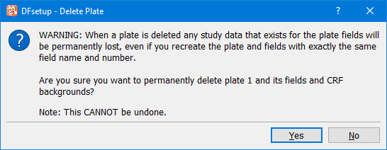 Select 'Yes' to permanently remove the current plate from the study setup, including all of its field definitions and background CRF images. Style definitions are not deleted even if they are no longer in use by any field. When a plate is deleted, any study data, queries and reasons existing for the plate are permanently lost, so exercise caution when performing this operation.