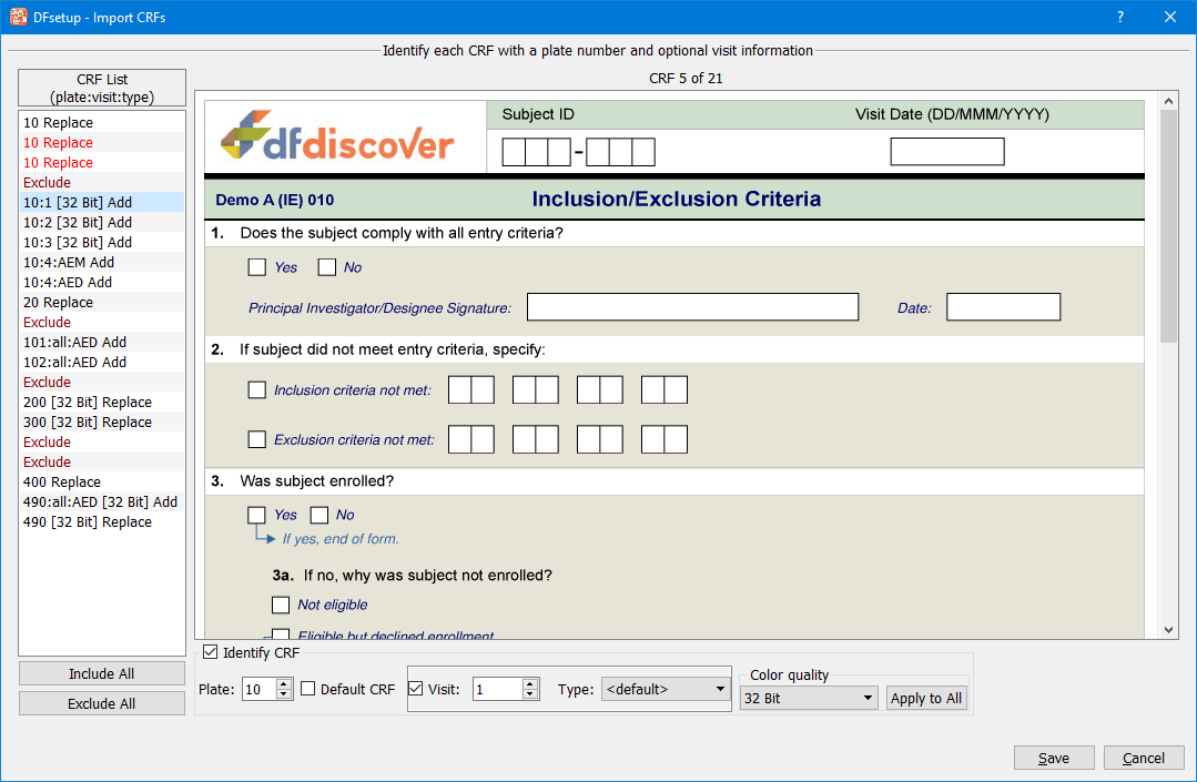 A study setup may include more than one data entry screen for each plate. Each imported CRF page can be tagged with the plate number and optionally also with a visit number and/or a type name. Pages tagged with a visit number are used as the data entry screen for the specified visits, and CRFs tagged with a type (e.g. a language) can be selected as an DFexplore user preference. Pages with only the plate number tag are referred to as 'Default' pages, and are displayed when no tagged page is available.