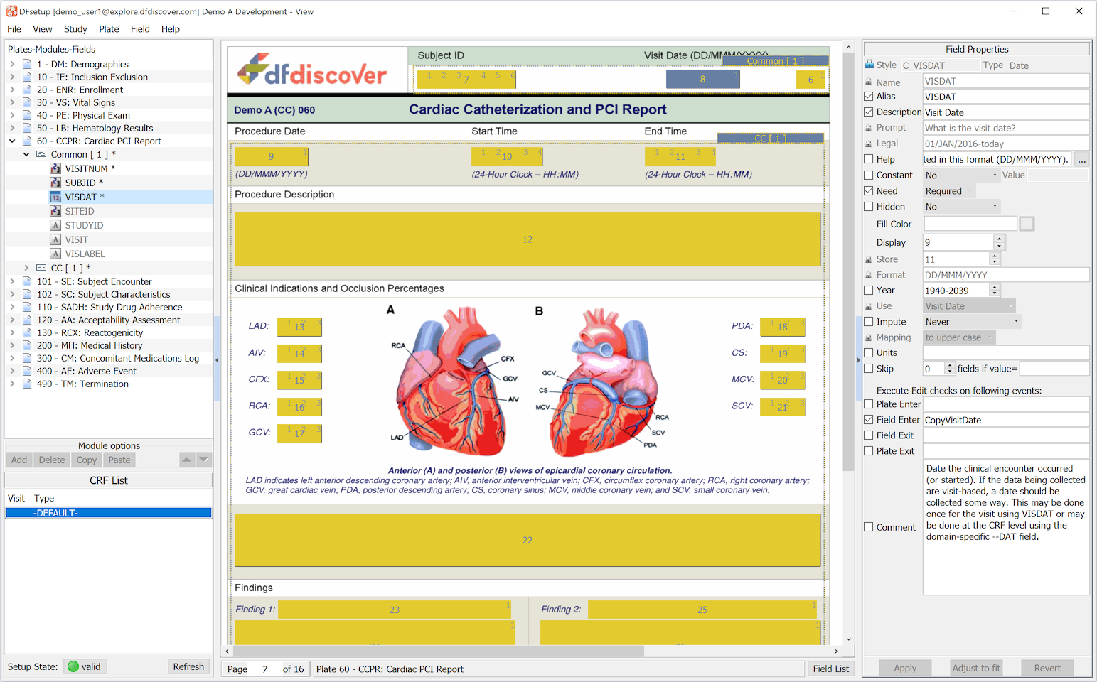 the CRF image window which shows the CRF plates that have been imported and the modules and data fields that have been defined for data entry, and